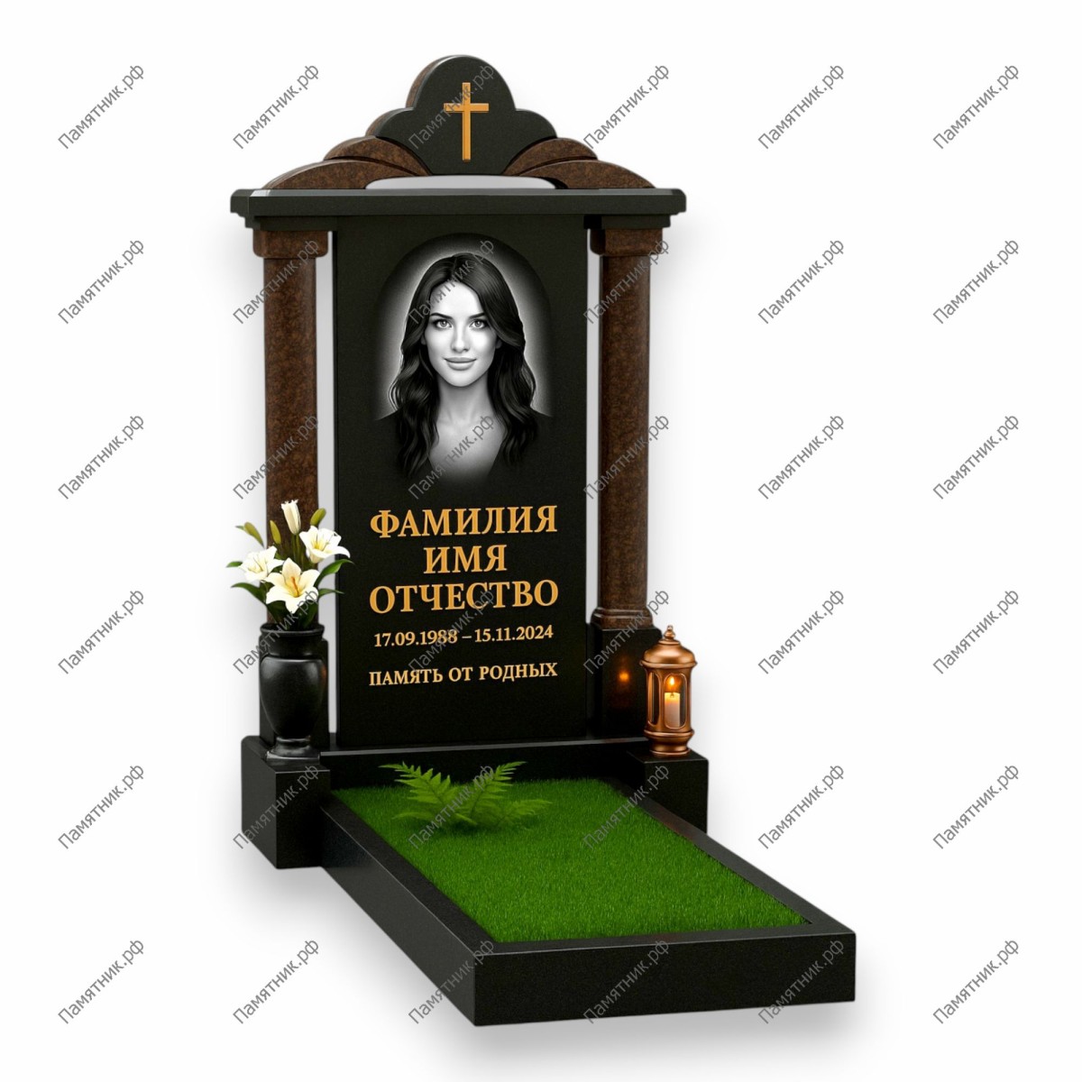 Архитектурный мемориал, стилизованный под фасад классического храма. Массивная арка из коричневого гранита опирается на резные колонны, обрамляя центральную черную плиту с портретом. Строгий четырехконечный крест венчает всю композицию, придавая ей завершенный духовный облик.