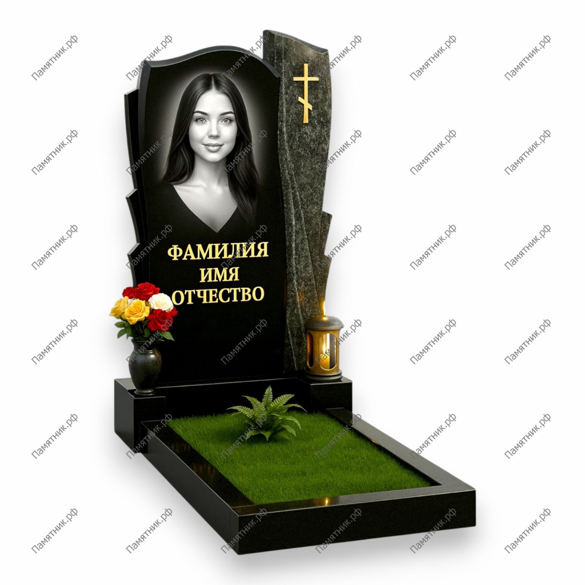 Элегантный мемориал со сложной многоуровневой резкой боковой грани, имитирующей динамичные ступени. Основная стела из черного гранита дополнена контрастной вертикальной вставкой из серо-зеленого камня с фактурной обработкой, что придает памятнику природную глубину и объем.