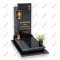 Современный комплекс в стиле минимализма. Прямоугольная вертикальная стела из черного гранита пересекается Г-образной вставкой из синего лабрадорита с эффектом внутреннего сияния. Дизайн продолжается в надгробной плите, где диагональная линия камня создает единую архитектурную нить.
