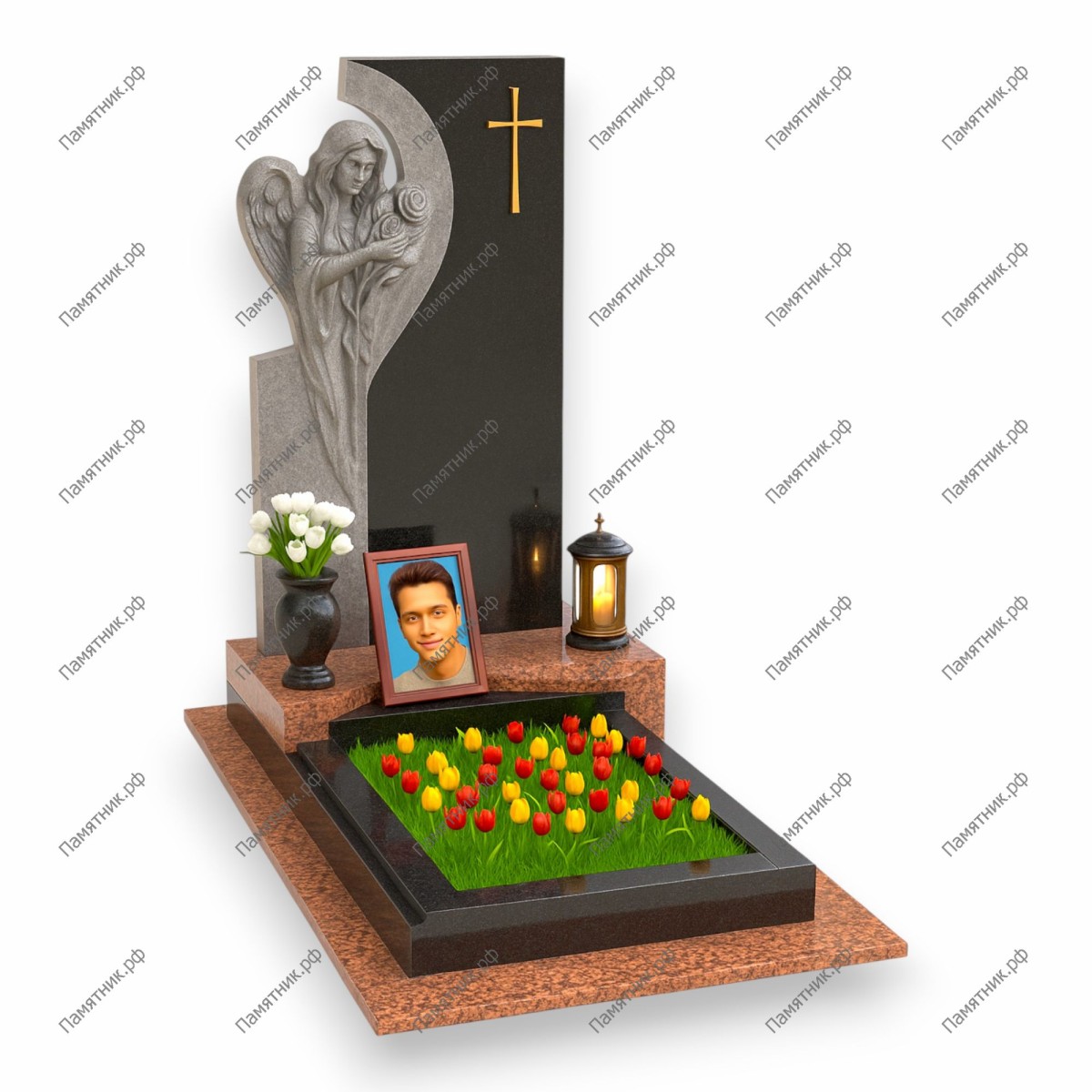 Величественный художественный мемориал, главной особенностью которого является барельеф ангела, нежно обнимающего стелу. Фигура ангела выполнена из светлого камня с высокой детализацией, создавая резкий контраст с основной темной плитой. Яркое надгробие с цветочной композицией завершает образ.