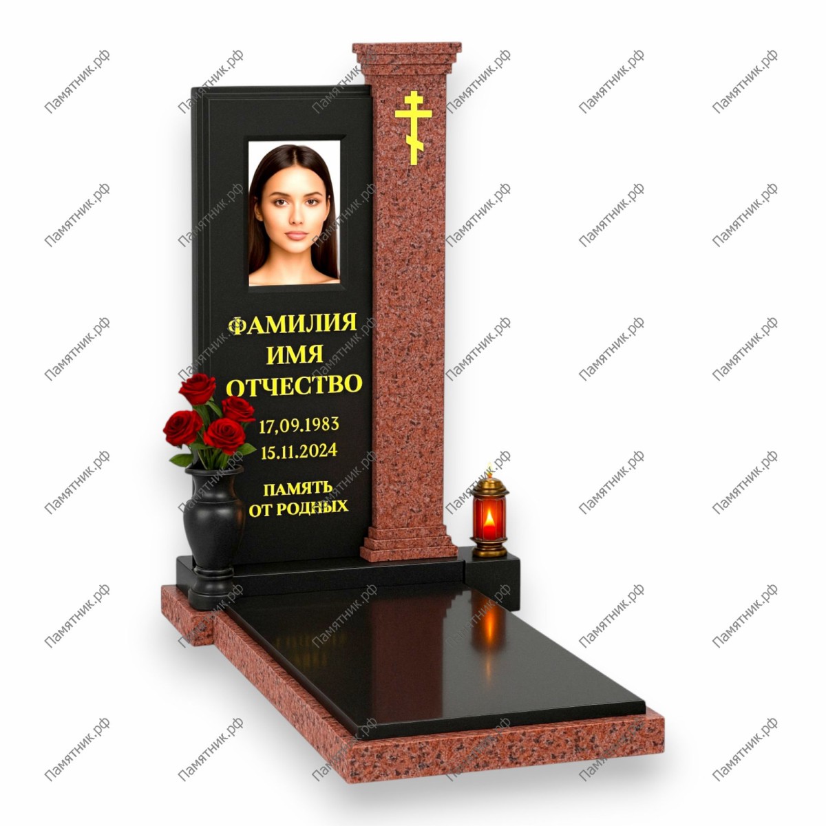 Монументальный комплекс, сочетающий строгую прямоугольную стелу и классический архитектурный элемент. Справа расположена массивная резная колонна из красного гранита с капителью, увенчанная золотым крестом. Дизайн подчеркивает величие и непоколебимость памяти.