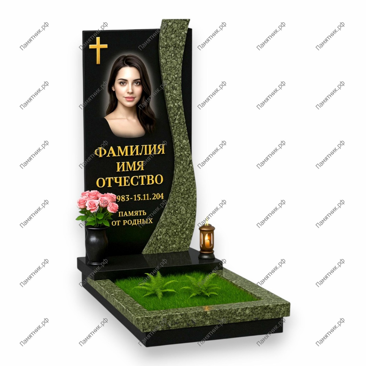 Тематический мемориал с использованием редкого гранита с зеленоватым оттенком. Черная стела разделена S-образной вставкой из фактурного камня, напоминающего лесную тропу или ручей. Основание цветника выполнено из того же зеленого камня, что создает эффект естественного ландшафта.