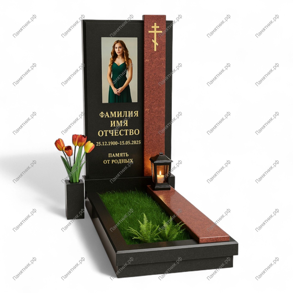 Безупречно строгий, лаконичный памятник для человека с сильным, прямым характером. Основу составляет высокая, ровная черная стела из габбро-диабаза. Правая сторона визуально отделена вертикальной декоративной полосой из красно-коричневого гранита. Эта линия словно нить судьбы или крепкий внутренний стержень, который всегда был присущ ушедшему.