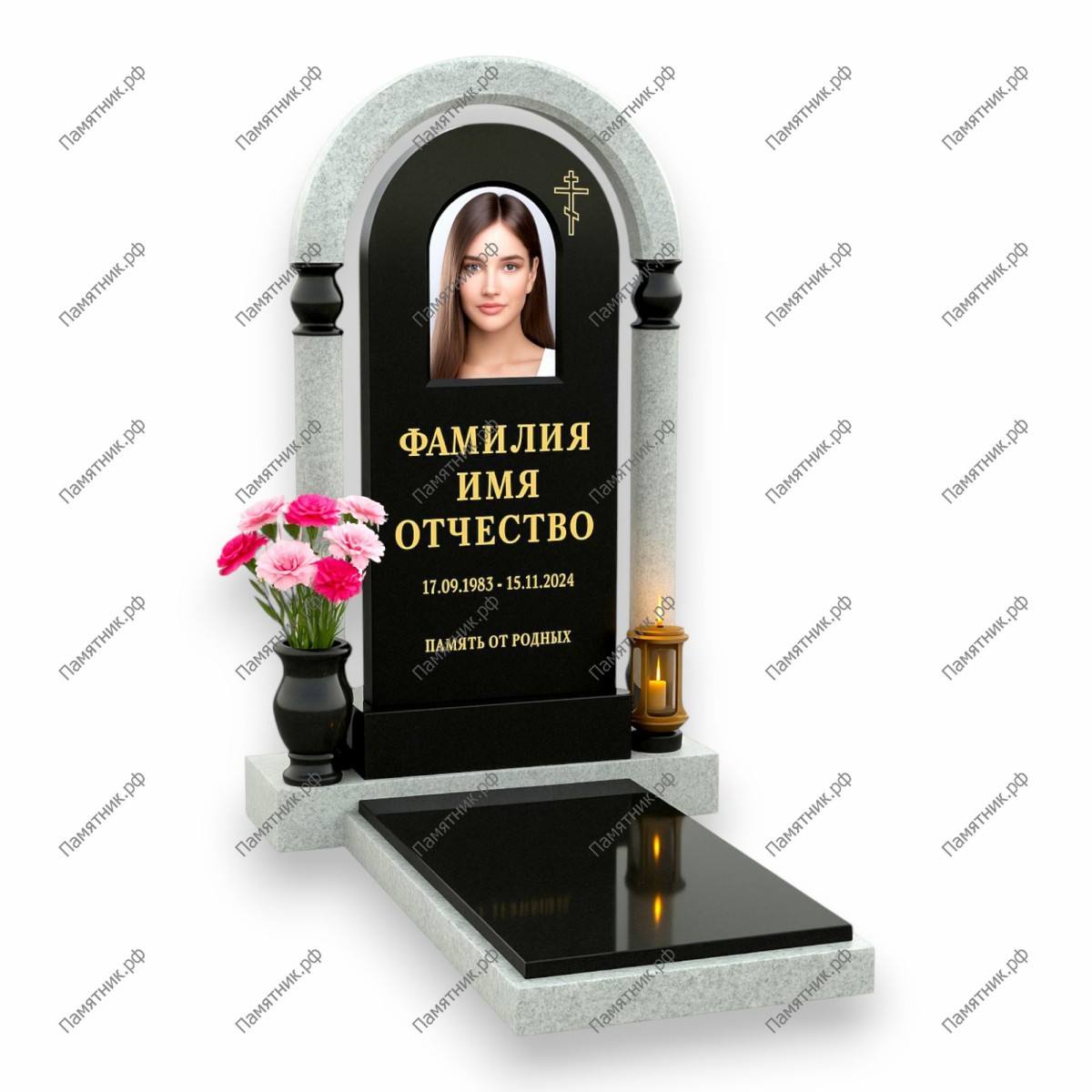 Величественный комплекс в неоклассическом стиле. Стела из черного гранита с арочной нишей обрамлена порталом из светло-серого камня с декоративными капителями. Строгое сочетание цветов и форм придает захоронению торжественный и благородный вид.