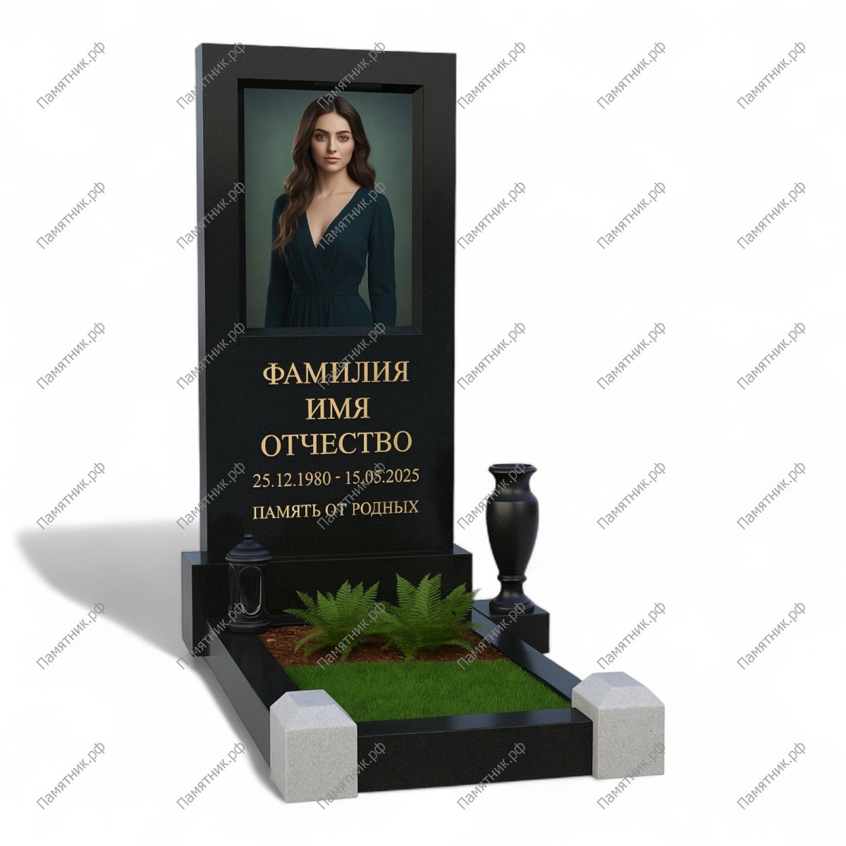 Современный мемориал, напоминающий окно в вечность. Стела выполнена в виде широкого черного монолита с глубокой прямоугольной нишей (фаской) по всему периметру портрета. Этот прием создает эффект картины или портала, акцентируя всё внимание на образе человека.