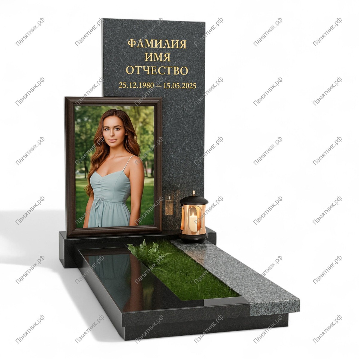 Апофеоз архитектурного минимализма. Стела представляет собой массивную плиту из темного фактурного гранита, на которую наложена идеально гладкая черная панель с портретом в рамке. Контраст между грубым рисунком камня и зеркальной полировкой создает невероятно сильный визуальный эффект. Газон внутри цветника добавляет композиции жизни и природного тепла.