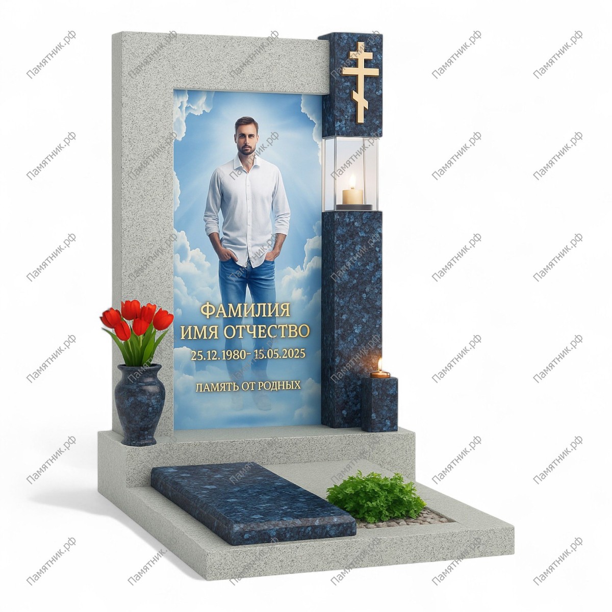 Один из самых технологичных и светлых макетов в коллекции. Широкая рама из светло-серого гранита обрамляет центральное полотно с изображением человека на фоне облачного неба. Справа расположена колонна из синего гранита (лабрадорита) с уникальной прозрачной нишей-фонарем, внутри которой горит свеча.