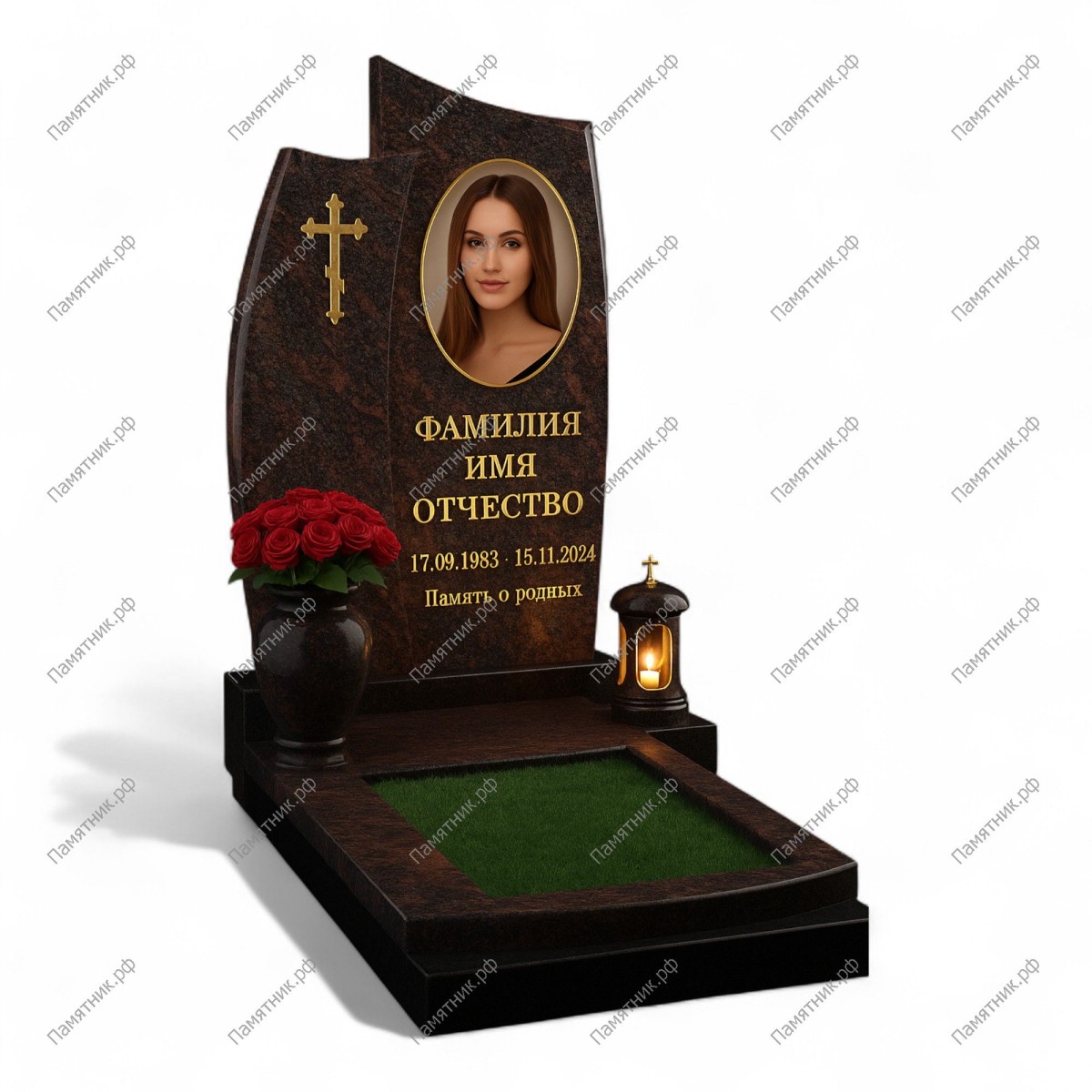 Пластичный и теплый по настроению комплекс. Стела выполнена из коричнево-красного гранита со сложным фигурным верхом, напоминающим языки пламени или изгиб листа. Овальный портрет и золотой текст органично вписаны в центр композиции.