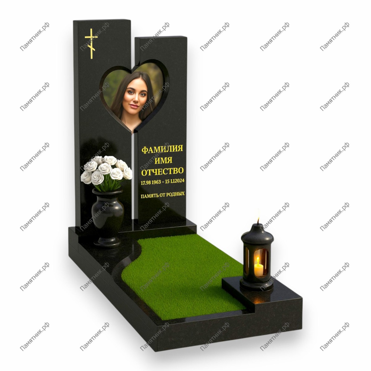 Элегантный и глубоко символичный комплекс в стиле современного минимализма. Главная фишка модели — сквозная ниша в форме сердца, прорезающая две массивные черные плиты разной высоты. Портрет расположен внутри этого «окна», что создает эффект глубины и защиты.