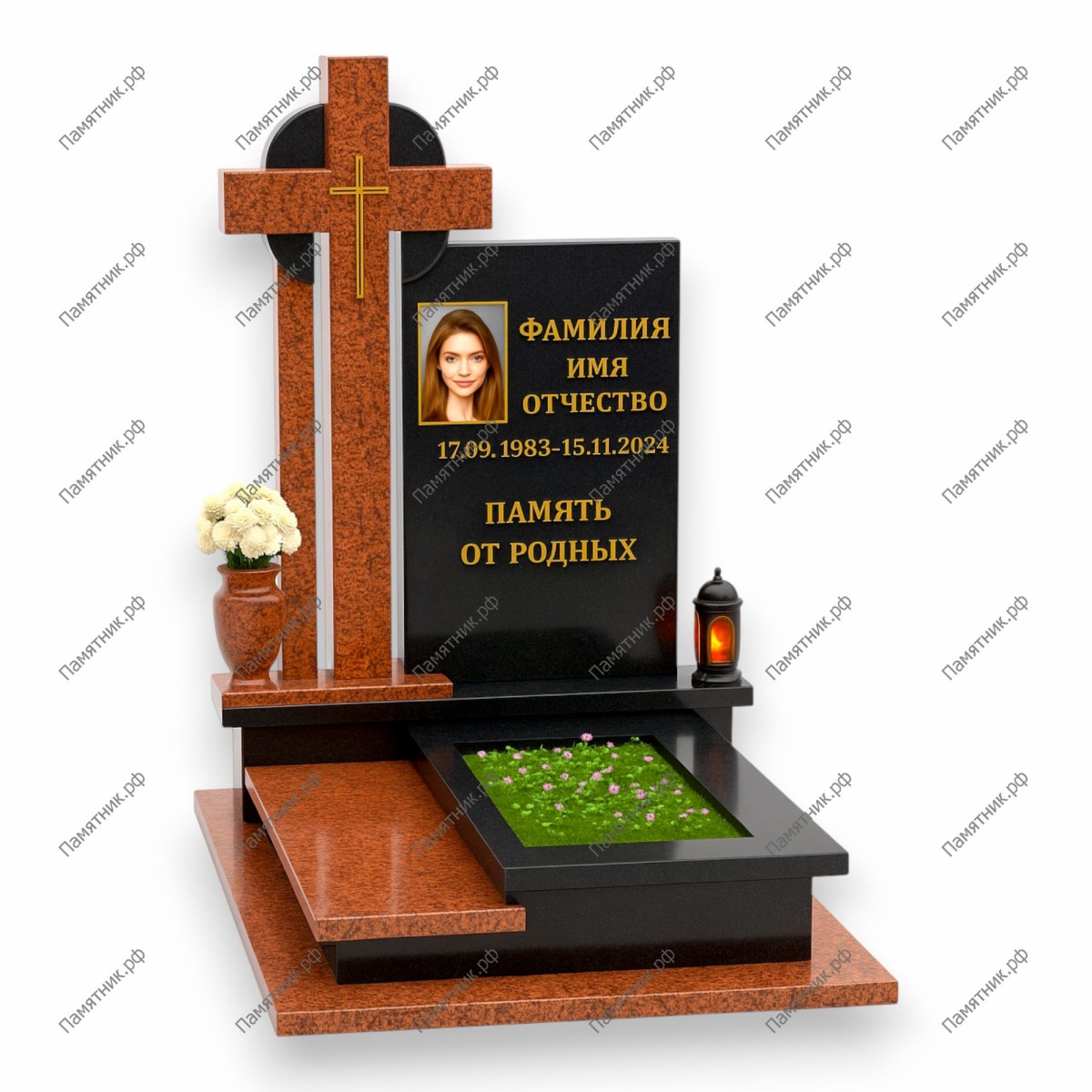 Ступенчатое основание из красного гранита создает эффект пьедестала, подчеркивая значимость и масштаб личности.