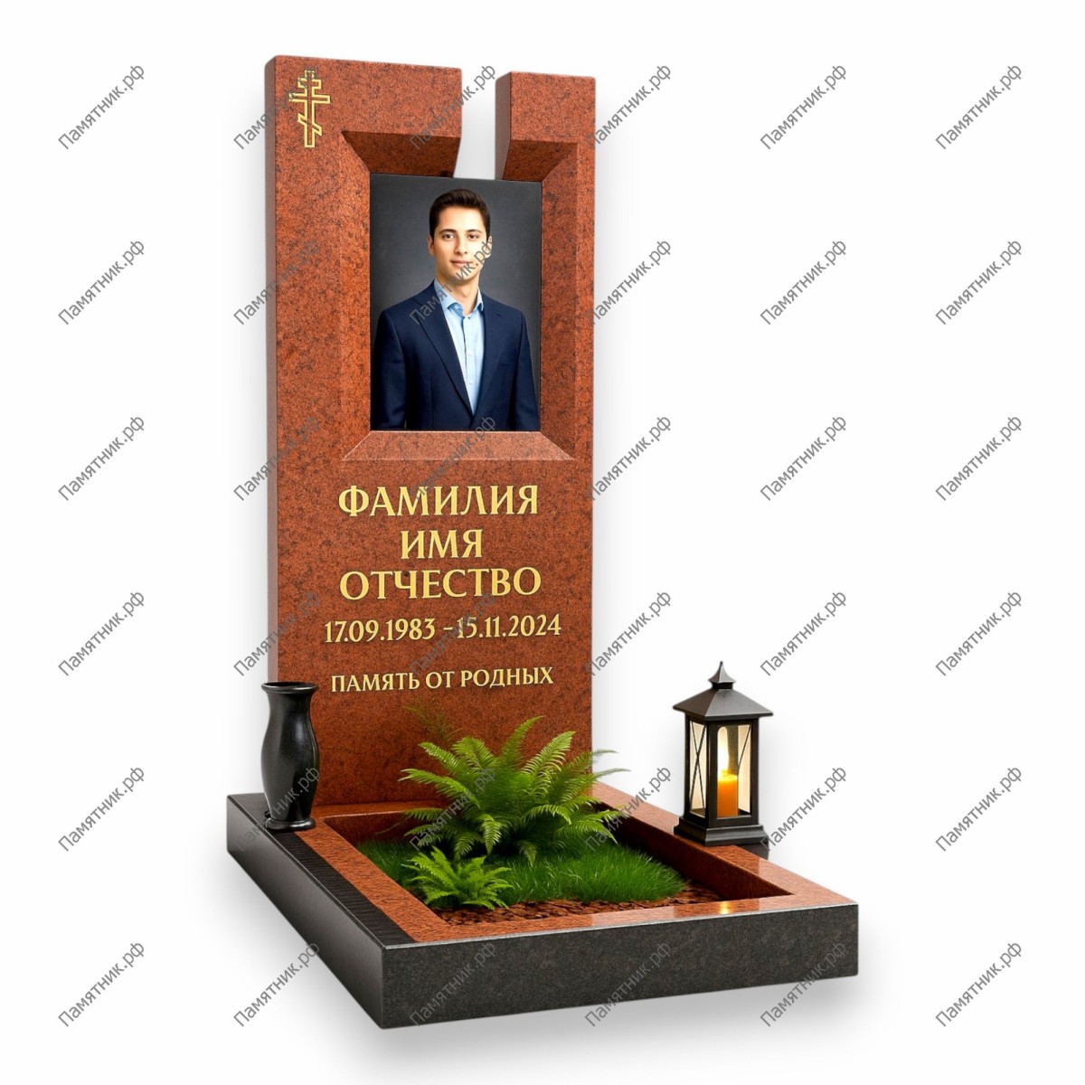 Строгий архитектурный проект из насыщенного красного гранита. Дизайн стелы имитирует портал: в центре массива сделана глубокая прямоугольная ниша, в которую «утоплен» портрет. Этот прием создает эффект картины или окна.