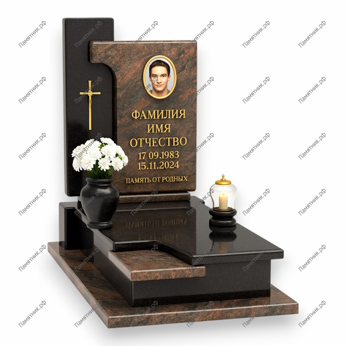 Современный комплекс, построенный на эффекте наслоения. Основа из черного глянцевого гранита дополнена массивной Г-образной панелью из фактурного коричневого камня. Это создает глубокий 3D-объем и позволяет зонировать стелу: на темном фоне расположен золотой крест, а на цветном — портрет и текст.