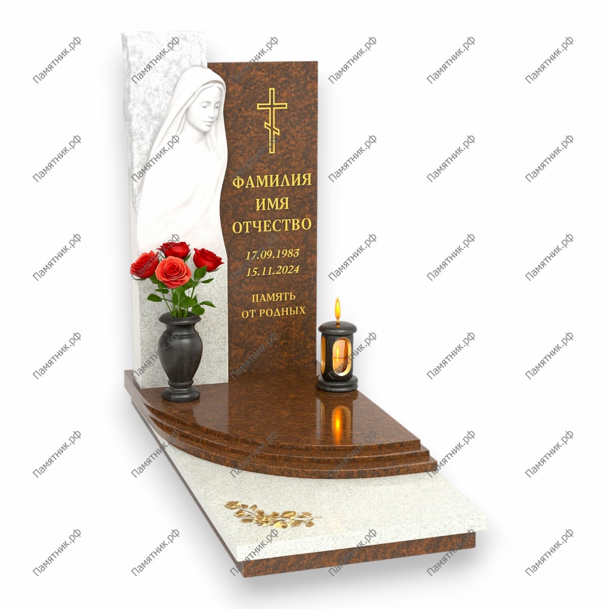 Шедевр мемориальной скульптуры. В левой части памятника расположена белоснежная фигура Скорбящей Девы, мастерски вырезанная из светлого камня. Она деликатно склонилась над основной плитой из красного гранита, создавая атмосферу глубочайшей нежности и вечной молитвы.