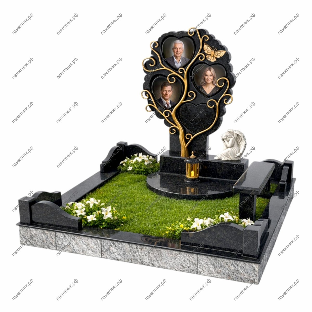 Потрясающий по своей красоте и символизму мемориальный ансамбль в виде раскидистого Древа Жизни. Силуэт черной стелы искусно вырезан в форме кроны, внутри которой расположены три ниши-сердца для портретов. Ствол, ветви, листья и порхающая бабочка покрыты изящной позолотой (бронзированием), что придает композиции невероятную легкость и теплоту. Рядом со стелой на массивном постаменте установлены фигура скорбящего ангела и бронзовая лампада. Участок обрамлен комбинированным гранитно-мраморным цоколем с удобной скамьей.
