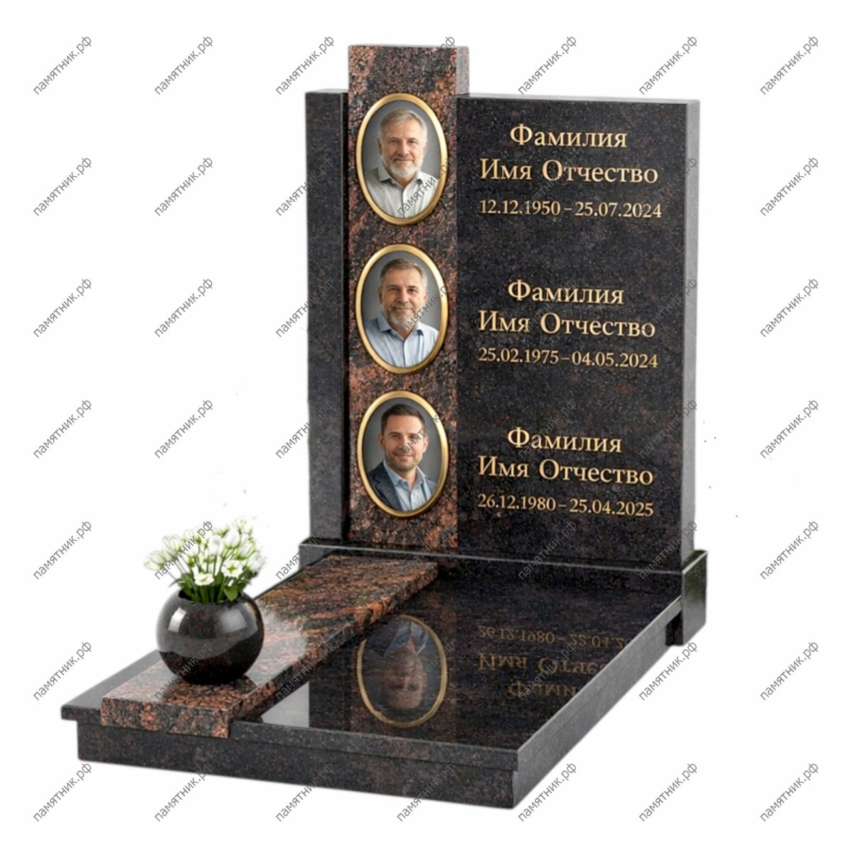 Эксклюзивная вертикальная модель, идеально подходящая для компактных семейных захоронений. Основой служит широкая черная стела, левая часть которой декорирована выступающей вертикальной панелью из благородного коричневого гранита. На этой цветовой панели изящно друг над другом расположены три овальных портрета в золотых рамках. Текстовая информация (ФИО и даты) размещена на основном черном фоне. Этот дизайн экономит пространство, сохраняя при этом премиальный и нестандартный внешний вид.