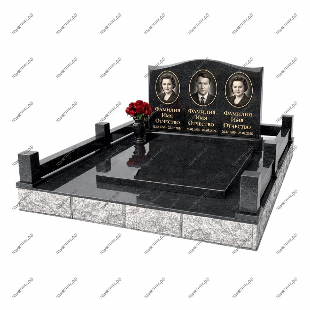 Величественный горизонтальный мемориал на масштабном гранитном подиуме. Широкая стела из габбро-диабаза имеет изящный волнообразный профиль. Использование овальных медальонов с золотой окантовкой и золотого шрифта придает памятнику выразительный контраст. Подиум облицован светло-серым фактурным камнем (скала) по торцам и полированными черными плитами сверху. Массивное ограждение в виде крупных столбов и перекладин завершает этот элитный архитектурный проект.