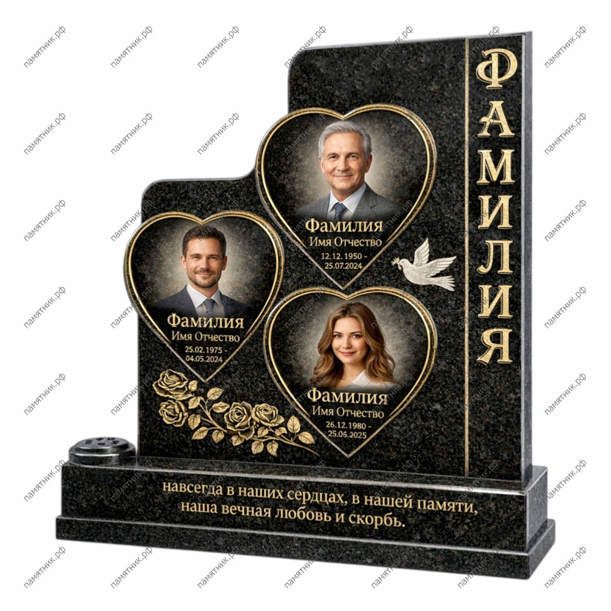 Роскошный и глубоко символичный мемориал, созданный для выражения бесконечной любви к ушедшим близким. Стела выполнена в форме сложной асимметричной композиции, включающей три врезных портрета в золотых рамках-сердцах. Нижняя часть украшена объемной резьбой в виде букета роз, а между портретами высечен летящий голубь — символ чистой души и мира. Массивный двухступенчатый подиум и цоколь с выгравированной эпитафией подчеркивают элитный статус этого памятника.
