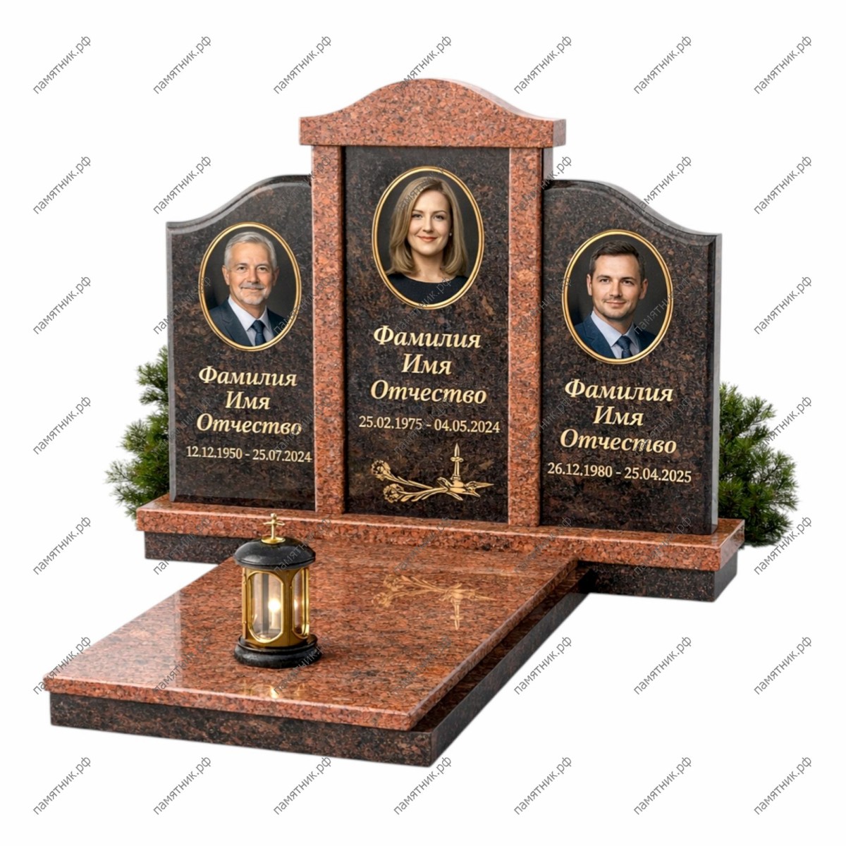 Яркий и торжественный мемориальный комплекс, построенный на контрасте черного габбро-диабаза и роскошного красного гранита. Композиция состоит из трех стел: центральная, более высокая, увенчана изящным карнизом, а боковые имеют симметричные плавные скосы. Портреты оформлены в овальные медальоны. Особую утонченность памятнику придают бронзовые элементы: накладной крест, ветвь роз под центральным портретом и стильная лампада. Участок облицован красным гранитом с аккуратным Т-образным цветником.