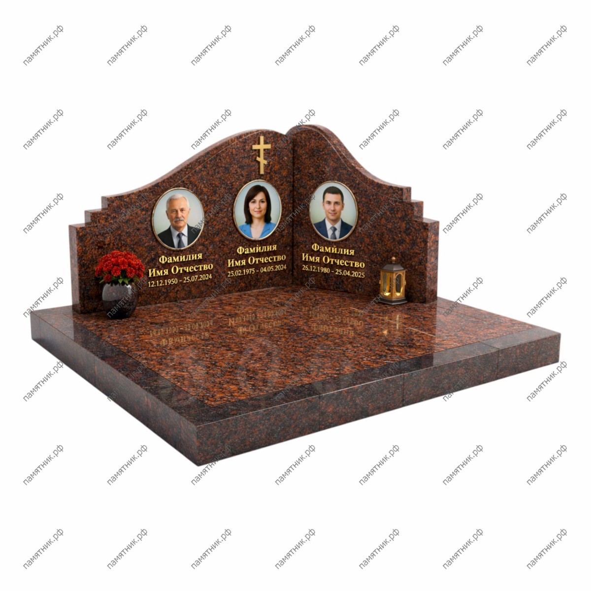Эксклюзивный угловой мемориал, полностью выполненный из благородного коричнево-красного гранита с выразительной природной текстурой. Такая архитектура идеально подходит для нестандартных участков, позволяя компактно и монументально разместить три портрета. В самом углу композиции возвышается строгий крест. Подиум полностью облицован полированными гранитными плитами в тон стелам, что придает захоронению монолитный и статусный вид.