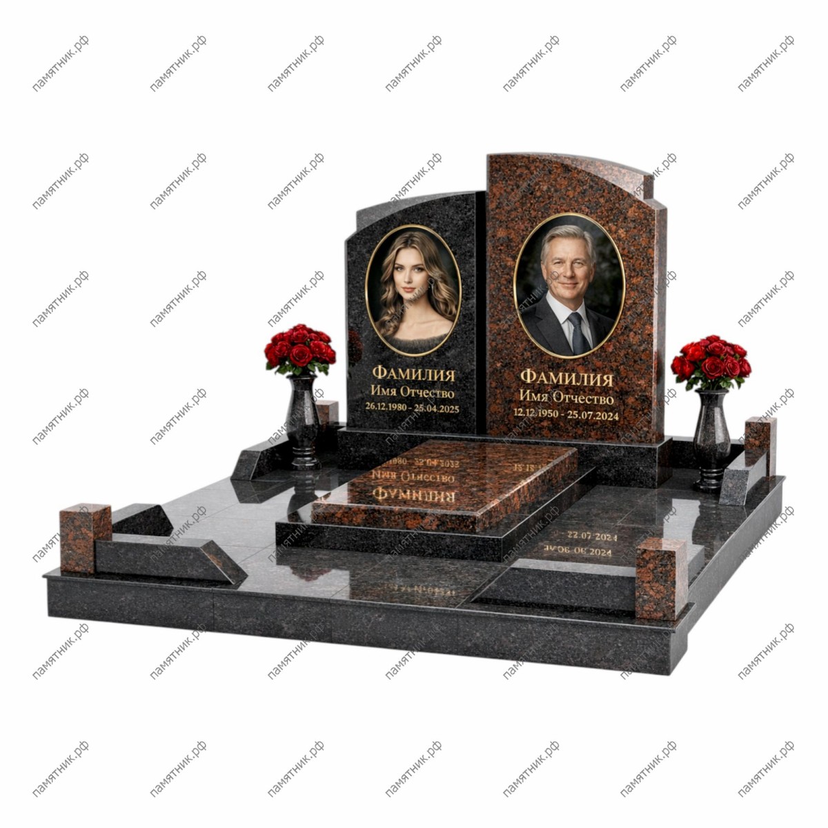 Современный семейный комплекс премиум-класса с выразительной асимметрией. Композиция разделена на две вертикальные стелы: изящную черную с плавным контуром и массивную прямоугольную из красивого коричневого гранита. В центре подиума расположена монументальная надгробная плита для нанесения дополнительных эпитафий или данных. Участок имеет сложное многоуровневое мощение с массивными декоративными уголками и бортами.