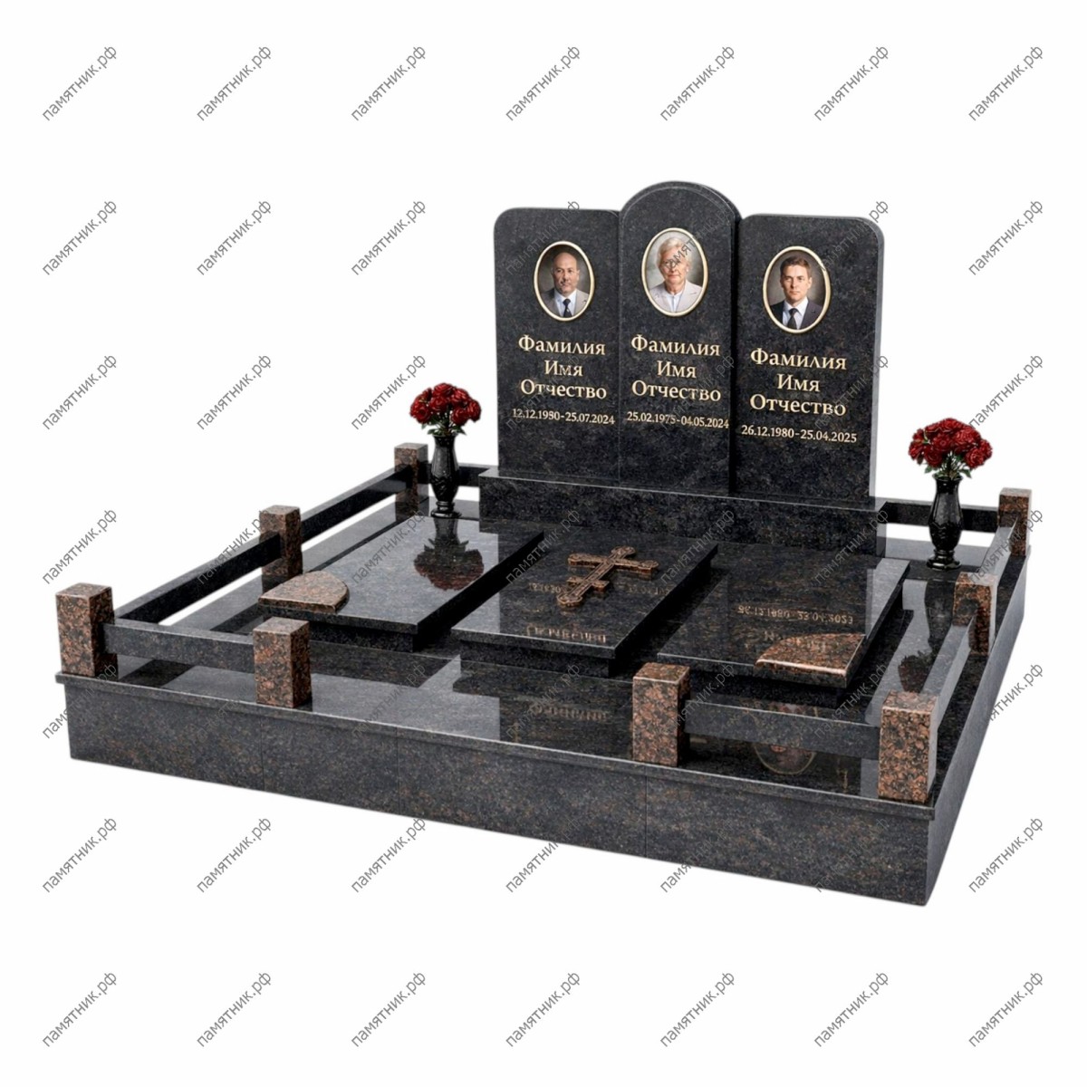 Фундаментальный классический комплекс, демонстрирующий надежность и нерушимость родовых традиций. Три черные стелы с арочными навершиями установлены на монументальный подиум из коричневого гранита. Участок полностью закрыт гранитными плитами и обнесен мощной балочной оградой с крупными кубическими столбами. В центре композиции на надгробной плите расположен объемный бронзовый крест.