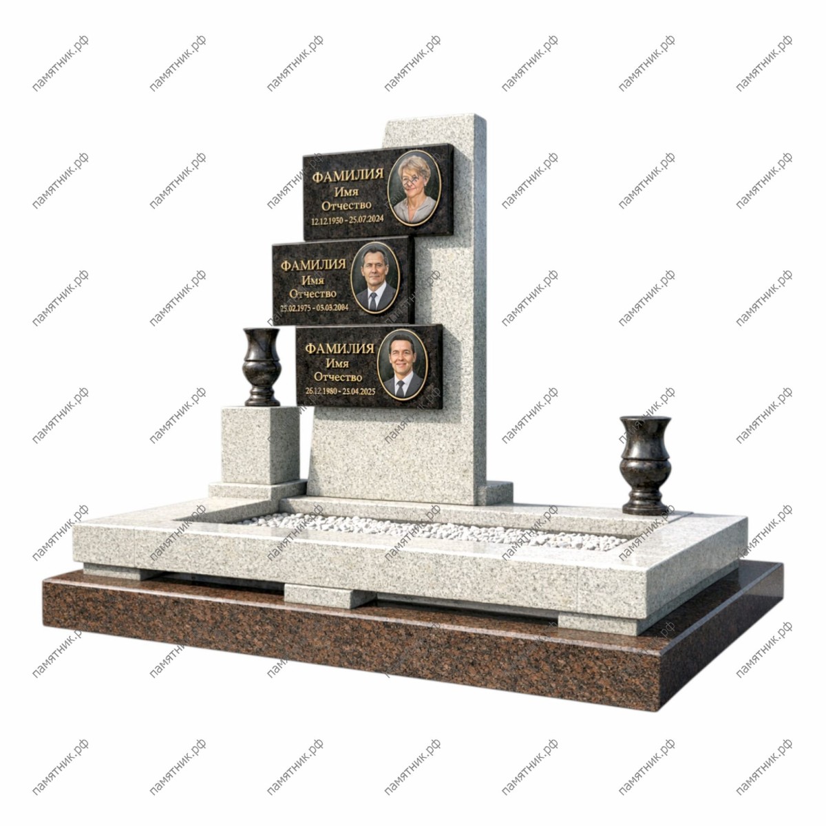 Светлый, устремленный ввысь мемориальный комплекс, построенный на игре контрастов. Основой служит высокая вертикальная стела из светло-серого гранита с фактурной обработкой краев. На нее каскадом закреплены три накладные таблички из черного гранита (габбро-диабаз), на которых размещены овальные портреты и золотые надписи.