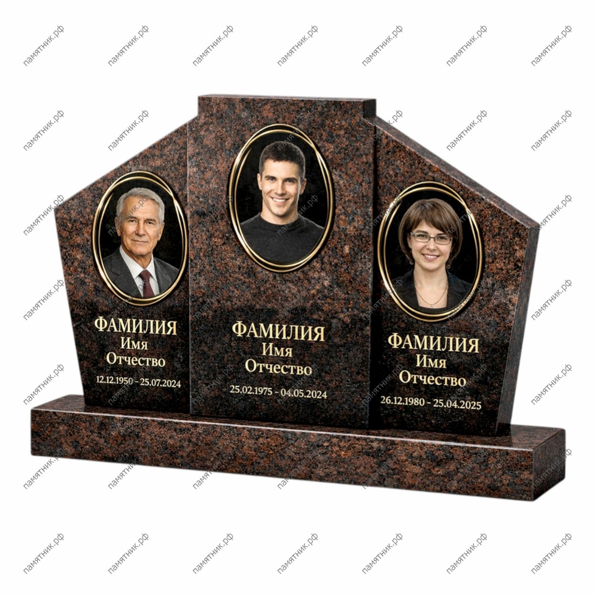 Монолитный и лаконичный горизонтальный памятник, выполненный из красивого коричнево-красного гранита с выразительной текстурой (вероятно, Дымовский гранит). Стела имеет форму широкого триптиха со скошенными верхними гранями, создающими форму трапеции.