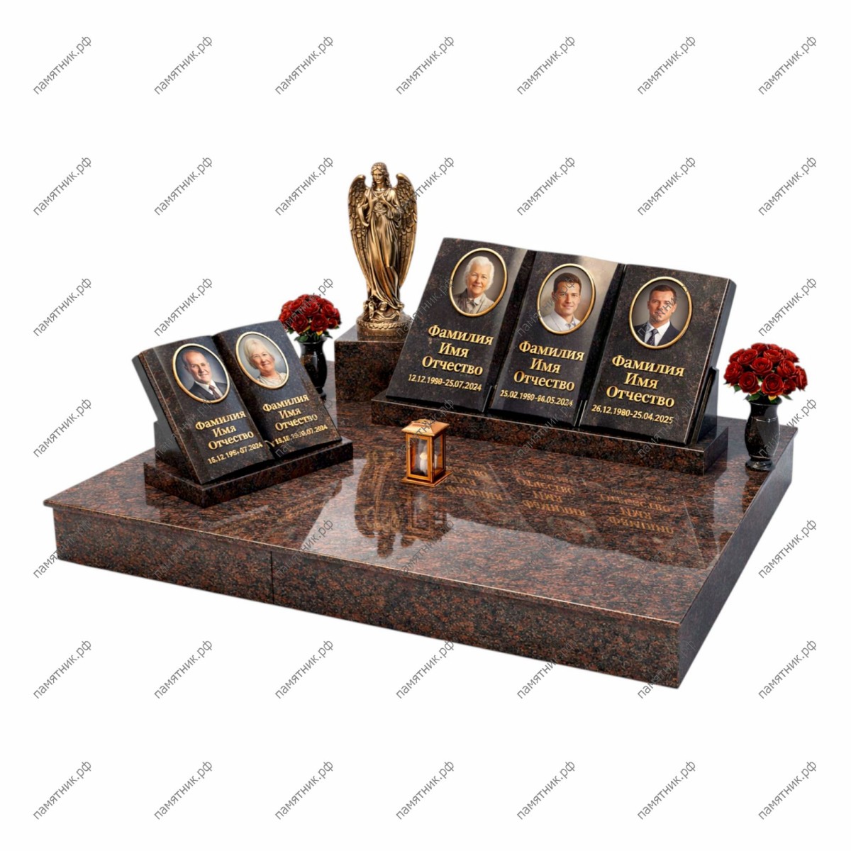 Роскошный мемориальный ансамбль нестандартной формы. Вместо традиционных вертикальных стел используются наклонные гранитные блоки, стилизованные под раскрытые фолианты или свитки, установленные на ступенчатом подиуме. Комплекс выполнен из темного гранита с благородными вкраплениями.