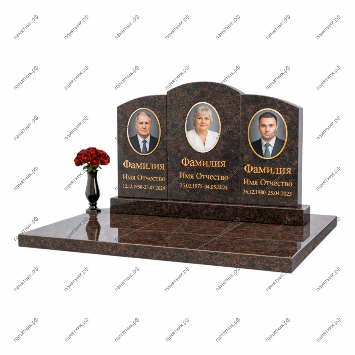 Элегантный и гармоничный памятник из красно-коричневого гранита. Три отдельные стелы установлены вплотную друг к другу, образуя единую линию с плавным дугообразным завершением (центральная часть выше боковых).