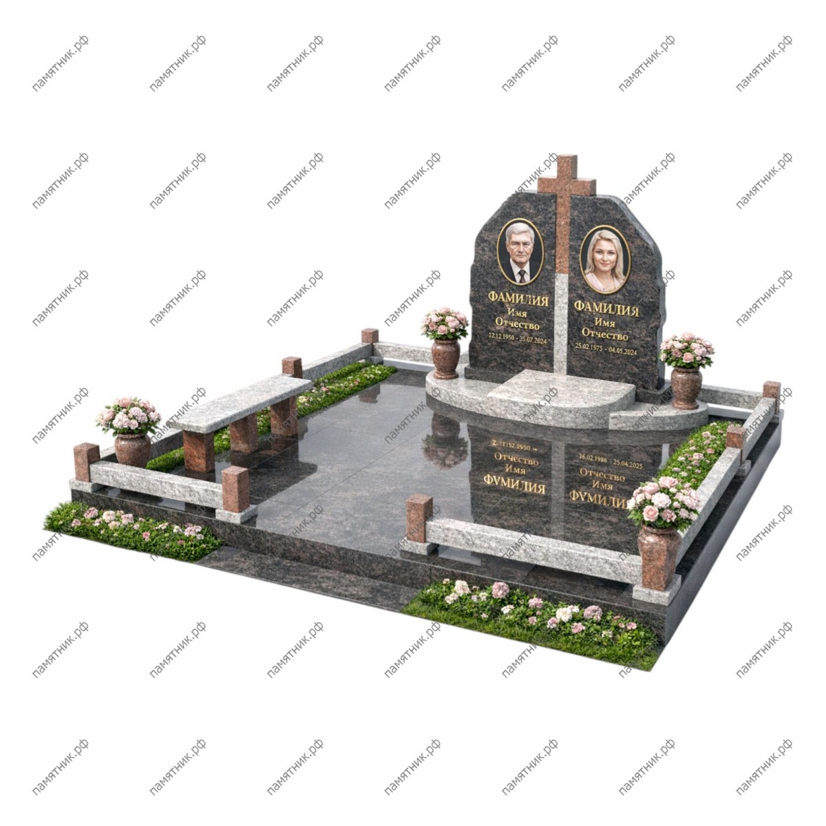- Особенности: Комплекс включает в себя интегрированные зоны отдыха — изящные гранитные скамейки, встроенные в фигурную ограду. Участок вымощен темным полированным гранитом с высокой отражающей способностью. По периметру предусмотрены открытые участки почвы для высадки живых растений, дополненные фигурными вазонами, что делает мемориал более «живым» и умиротворенным.