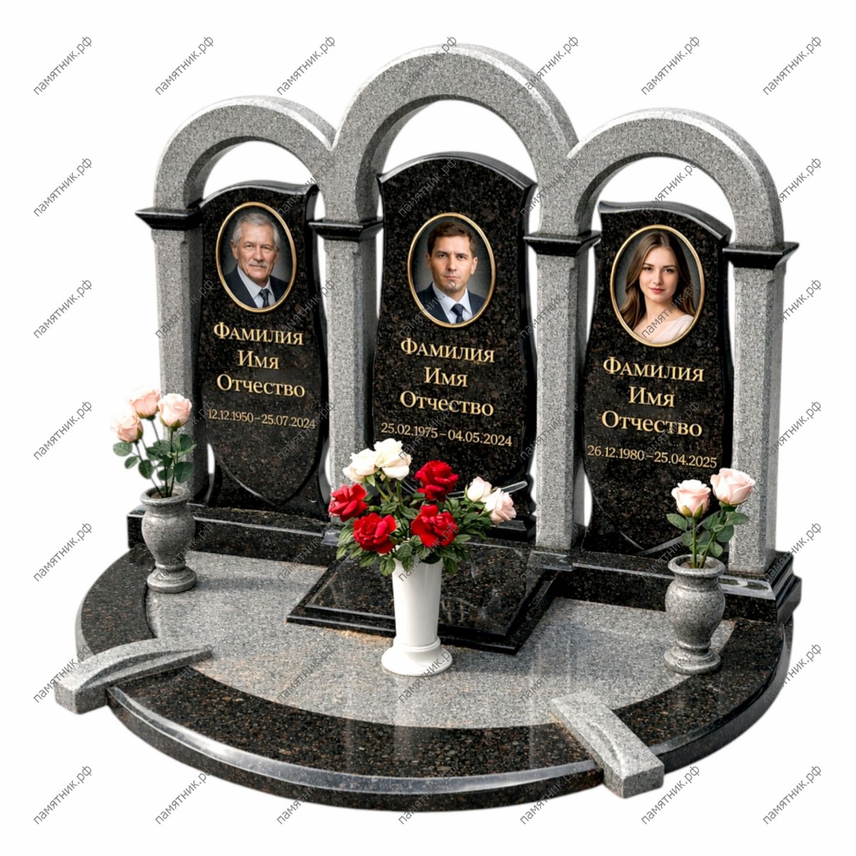 - Особенности: Комплекс установлен на эксклюзивный полукруглый (радиальный) цоколь, комбинирующий светлый и темный камень. В центре организована небольшая прямоугольная клумба для живых цветов (или установки декоративной вазы). По краям дугообразного основания симметрично расположены фигурные светлые вазы из гранита.
