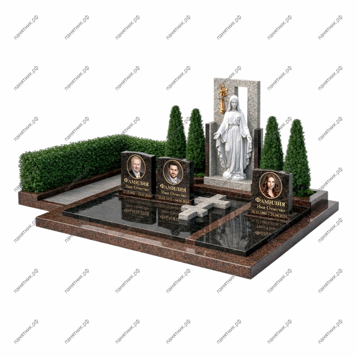- Особенности: Три классические черные стелы с портретами расположены симметрично перед статуей. На идеально ровной поверхности из полированного черного гранита, закрывающей захоронение, горизонтально уложен массивный крест из светлого камня. Комплекс обрамлен красным гранитом и подразумевает интеграцию с ландшафтным дизайном (живая изгородь по периметру).