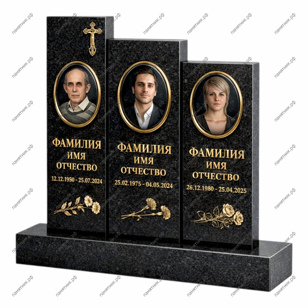 - Особенности: На каждой стеле размещены цветные портреты в овальных рамках с золотым кантом. Под портретами глубокой рубкой нанесены ФИО и даты жизни, а в нижней части выгравированы цветочные композиции (гвоздики и розы), покрытые сусальным золотом. Вся композиция установлена на единый массивный прямоугольный постамент, подчеркивающий целостность семейного захоронения.