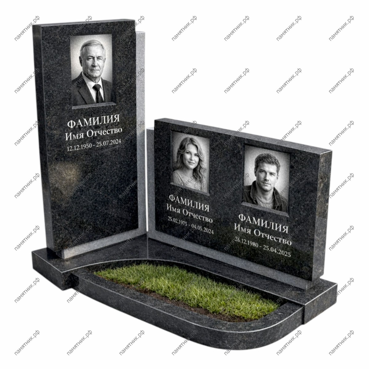 Современный и асимметричный эксклюзивный мемориал. Разделен на две смысловые зоны: высокая вертикальная стела для одного человека (главы семьи) и широкая горизонтальная плита для двоих. Черные элементы эффектно оттеняются подложками (барельефами) из светло-серого гранита. Комплекс установлен на масштабное гранитное основание с уникальным скругленным вырезом под цветник, создающим плавную, обтекаемую форму всего подиума.