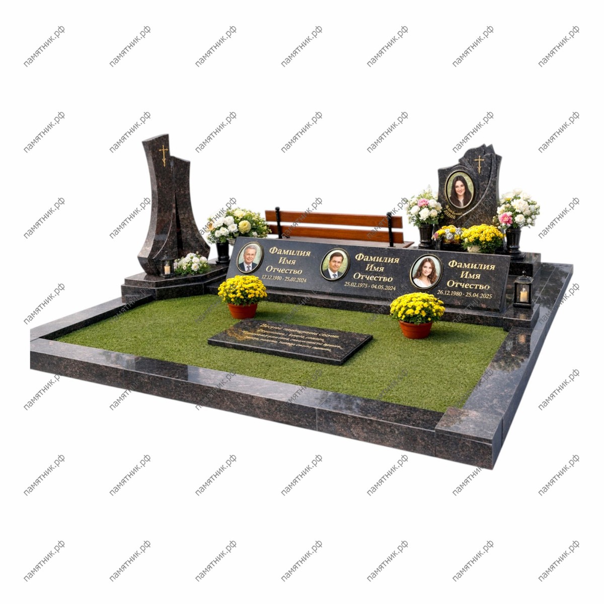 Грандиозный архитектурный ансамбль, создающий атмосферу настоящего мемориального парка. В центре расположена низкая, горизонтальная плита для трех портретов в овальном обрамлении. По бокам комплекса возвышаются две массивные архитектурные стелы сложной формы с крестами. Вся композиция установлена на подиум из коричневого гранита, а на заднем плане предусмотрена скамья для поминовения. Это выбор для тех, кто хочет создать фундаментальное родовое захоронение.