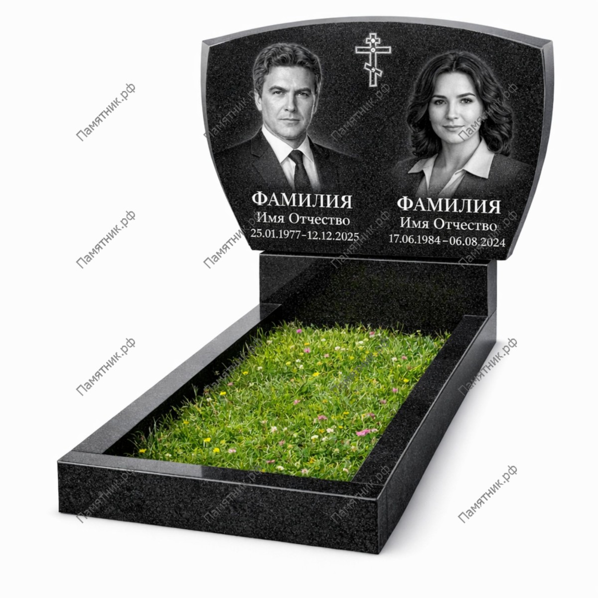 Памятник двойной ПД-10 представляет собой монументальную стелу с плавным купольным завершением. Это классическое решение для семейного захоронения, где центральный православный крест объединяет портреты близких людей в общую духовную композицию.