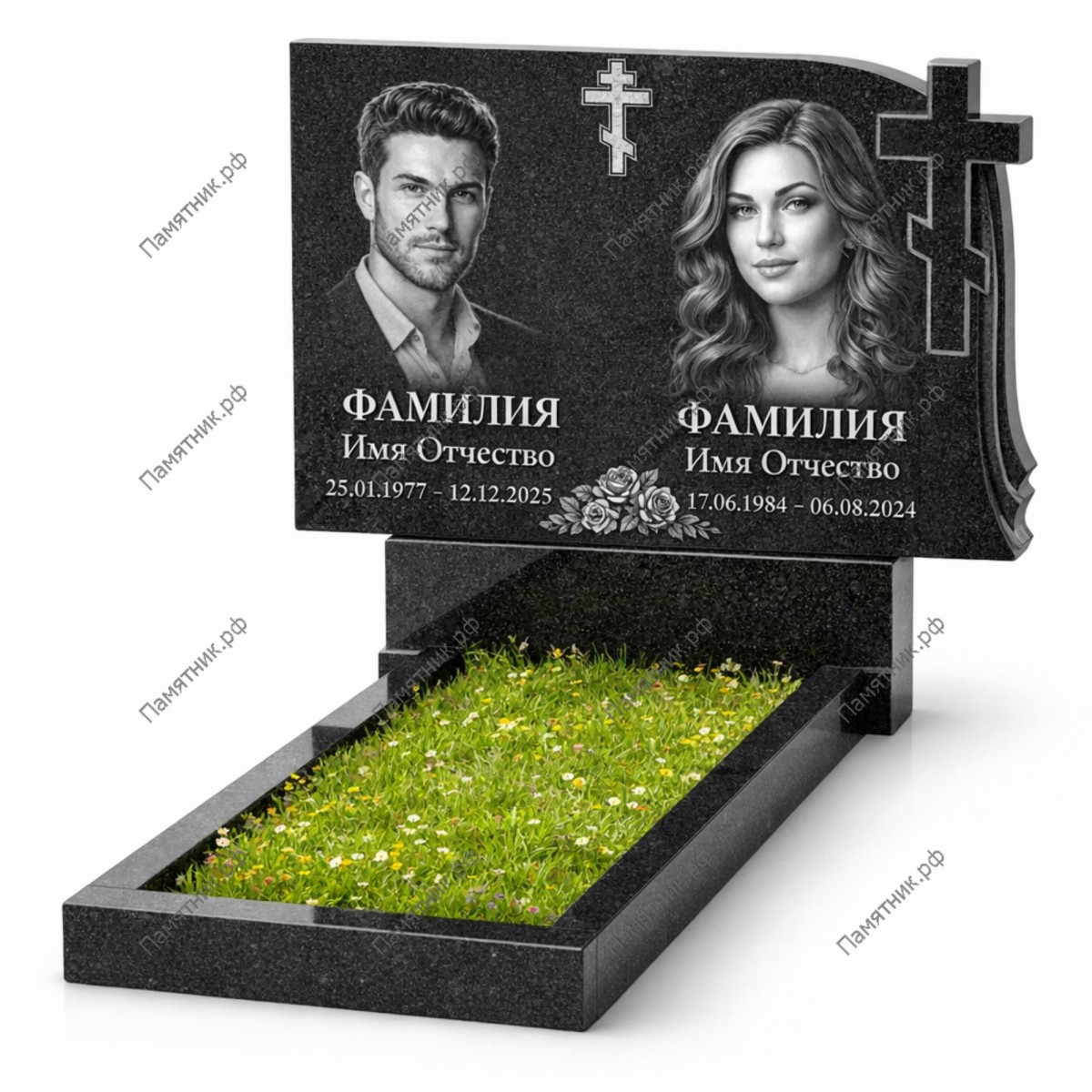 Двойная стела обеспечивает визуальный баланс при размещении данных двух человек. В комплект входит массивный цветник.
