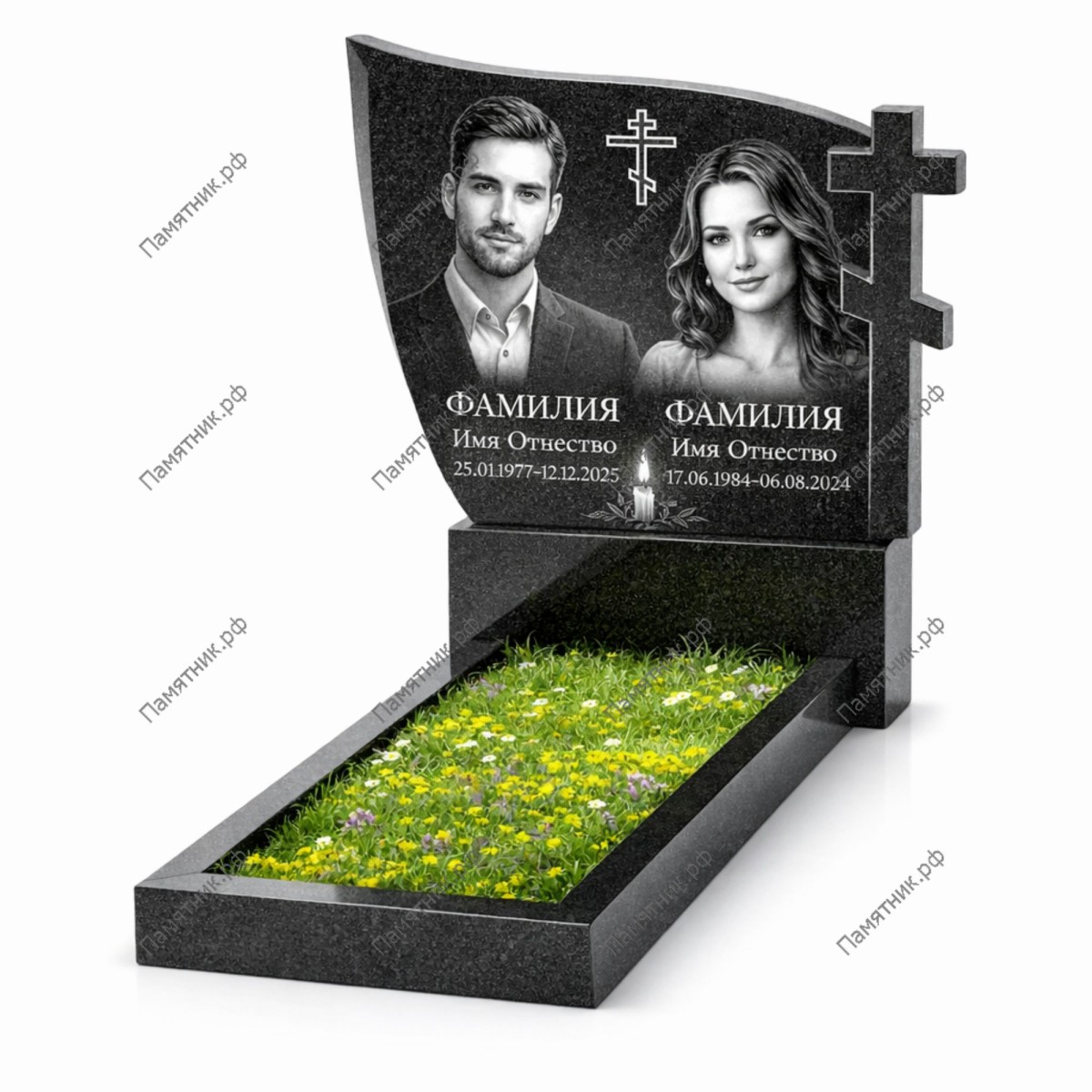Форма стелы выглядит современно и выразительно, при этом широкое поле позволяет симметрично расположить все необходимые данные. В стоимость включен гранитный цветник.