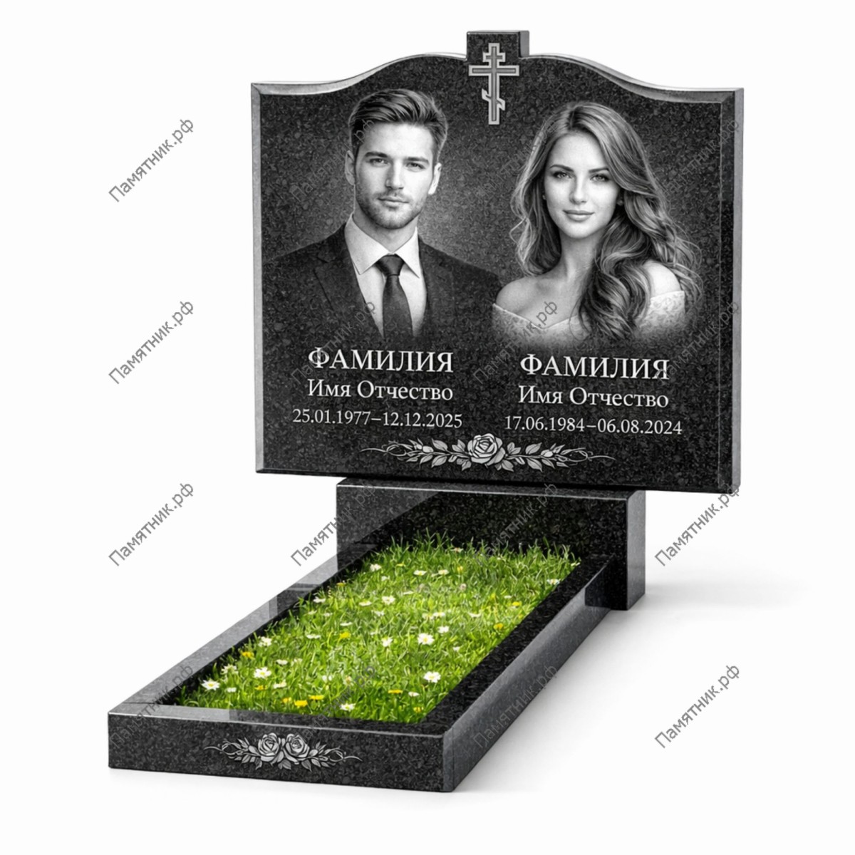 Памятник двойной ПД-2 — это выразительный мемориал с мягким волнообразным верхом, увенчанный лаконичным накладным или резным крестом в центре. Особое изящество модели придает художественная гравировка роз у основания стелы и на переднем брусе цветника, символизирующая неувядающую любовь и вечную память.