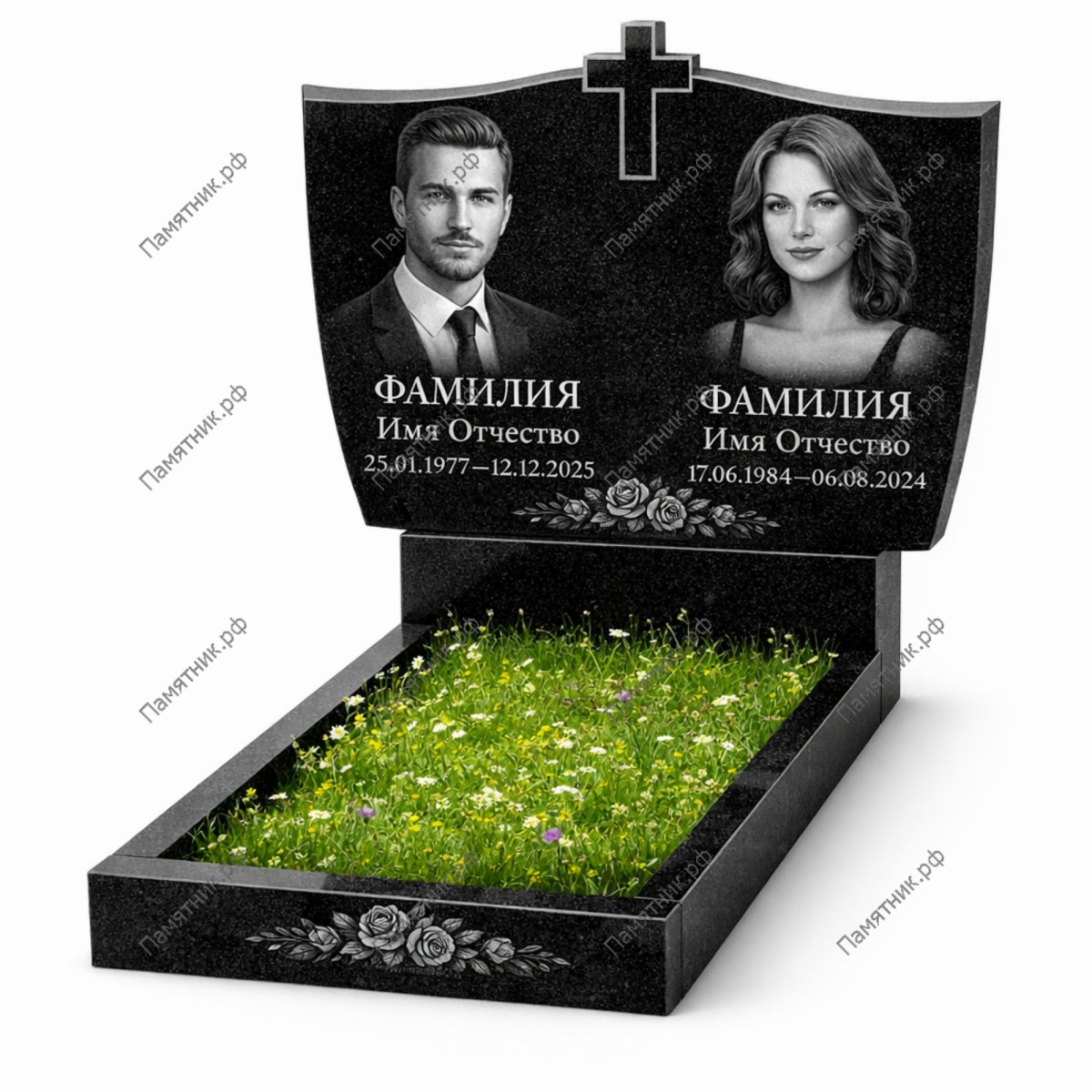 Памятник двойной ПД-20 — благородный мемориал с мягким купольным изгибом. Особенностью модели является акцентная гравировка роз по нижнему краю стелы и центральный православный крест, что в сочетании создает образ, исполненный любви, смирения и уважения к традициям.