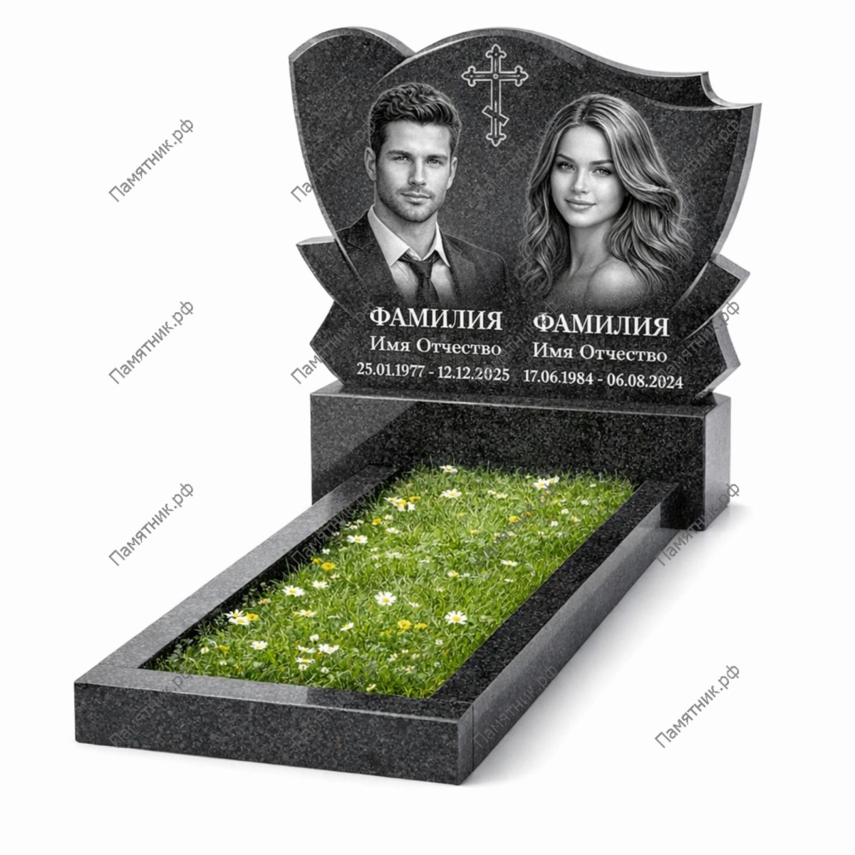 Памятник двойной ПД-24 — это эксклюзивная модель со сложной фигурной резкой. Силуэт стелы напоминает раскрывающийся цветок или парус, стремящийся ввысь. В верхнюю часть композиции интегрирован резной православный крест, выполненный с высокой художественной точностью.
