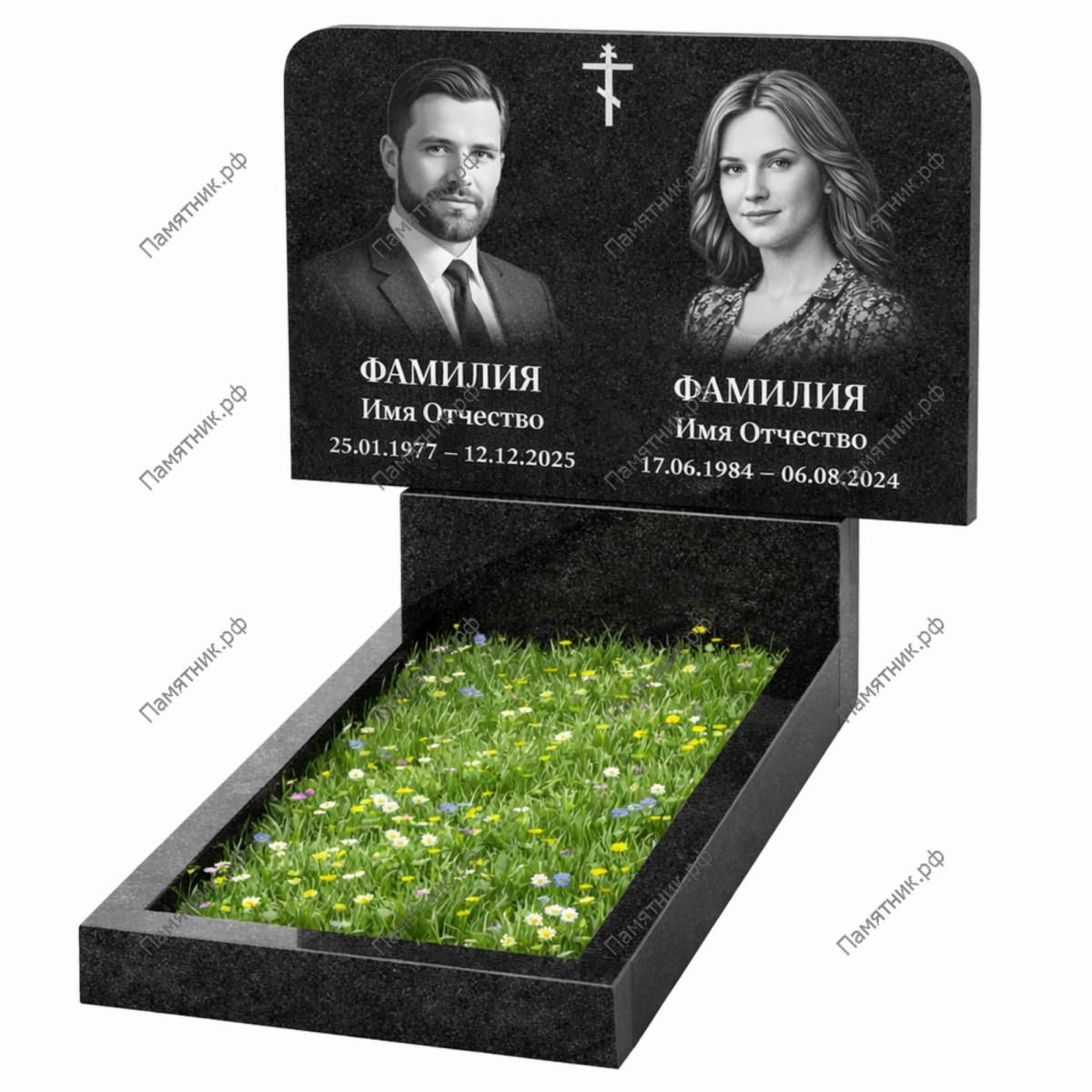 Широкая стела удобна для размещения парных портретов высокой детализации. В стоимость включен гранитный цветник, завершающий ансамбль.