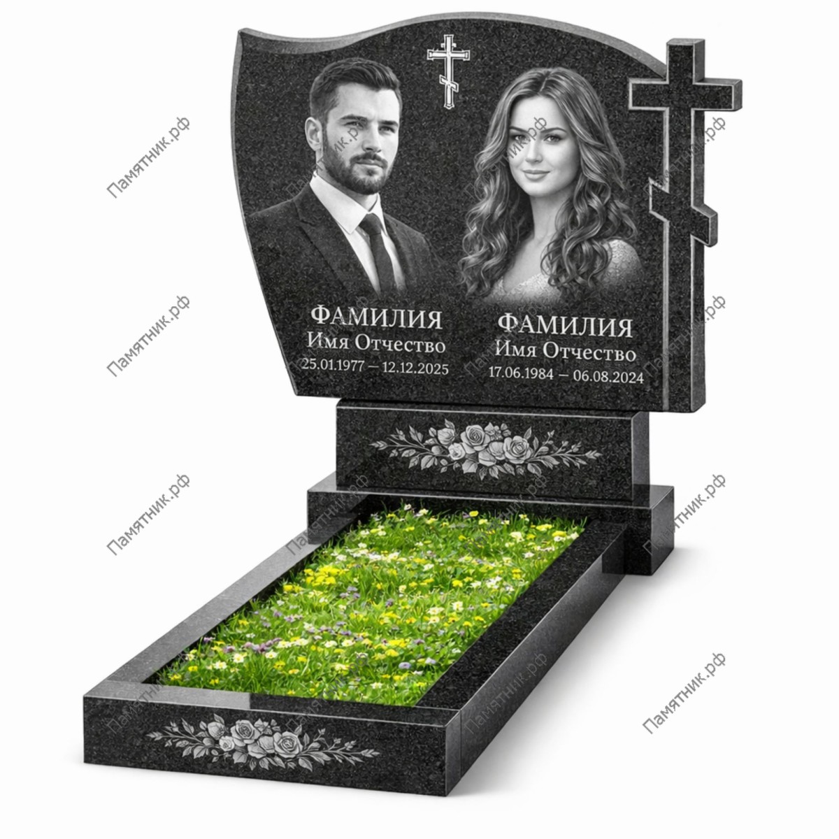 Комплект изготовлен из премиального карельского гранита Габбро-диабаз. Камень обладает эталонной прочностью, не тускнеет со временем и полностью защищен от климатических воздействий. Зеркальная полировка всех элементов подчеркивает природную мощь черного гранита, превращая его в безупречный фон для портретной гравировки.