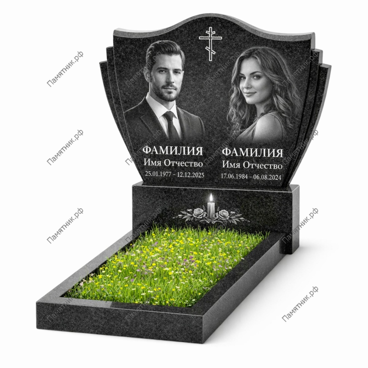 Памятник двойной ПД-38 — это благородная классика с уникальными резными деталями. Памятник представляет собой традиционную арку, дополненную декоративными вырезами у основания стелы. Этот архитектурный прием создает эффект колонн, поддерживающих небесный свод, что придает памятнику законченный и торжественный вид. Комплект выглядит цельно и гармонично.