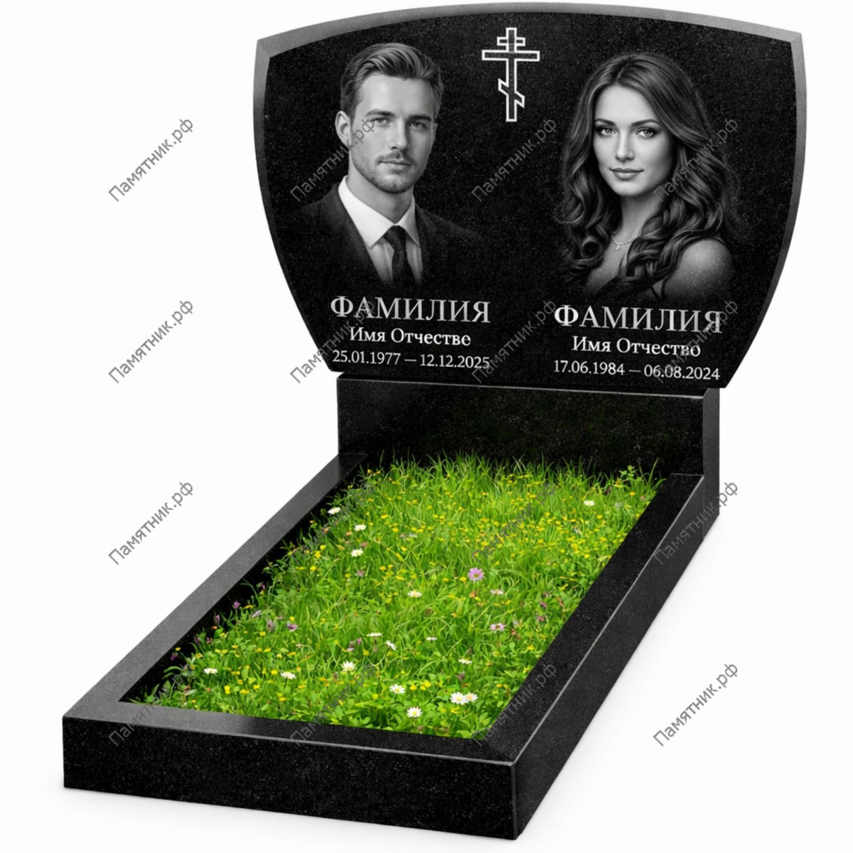 Памятник двойной ПД-41 — это эксклюзивная модель со сложной художественной обработкой. Левая боковая грань стелы выполнена в виде динамичных ступенчатых волн, имитирующих движение ткани или пламени свечи. Этот рельефный элемент придает массивному гранитному монолиту особую одухотворенность и визуальный объем.