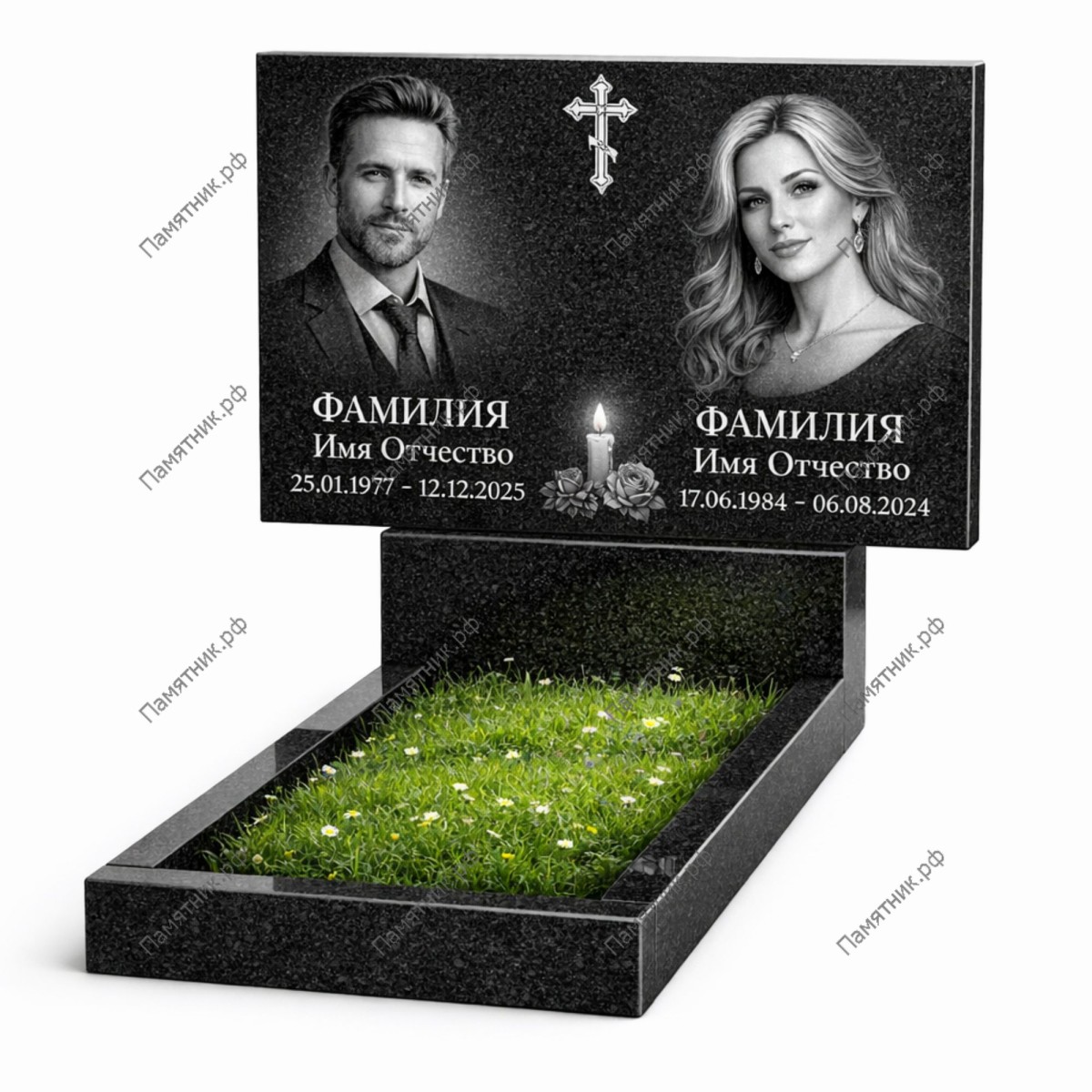 Для производства используется отборный карельский гранит. Благодаря своей исключительной плотности, камень полностью защищен от воздействия влаги и выветривания. Идеальная зеркальная полировка поверхности создает глубокий эффект, на котором портреты и эпитафии выглядят четко и выразительно.