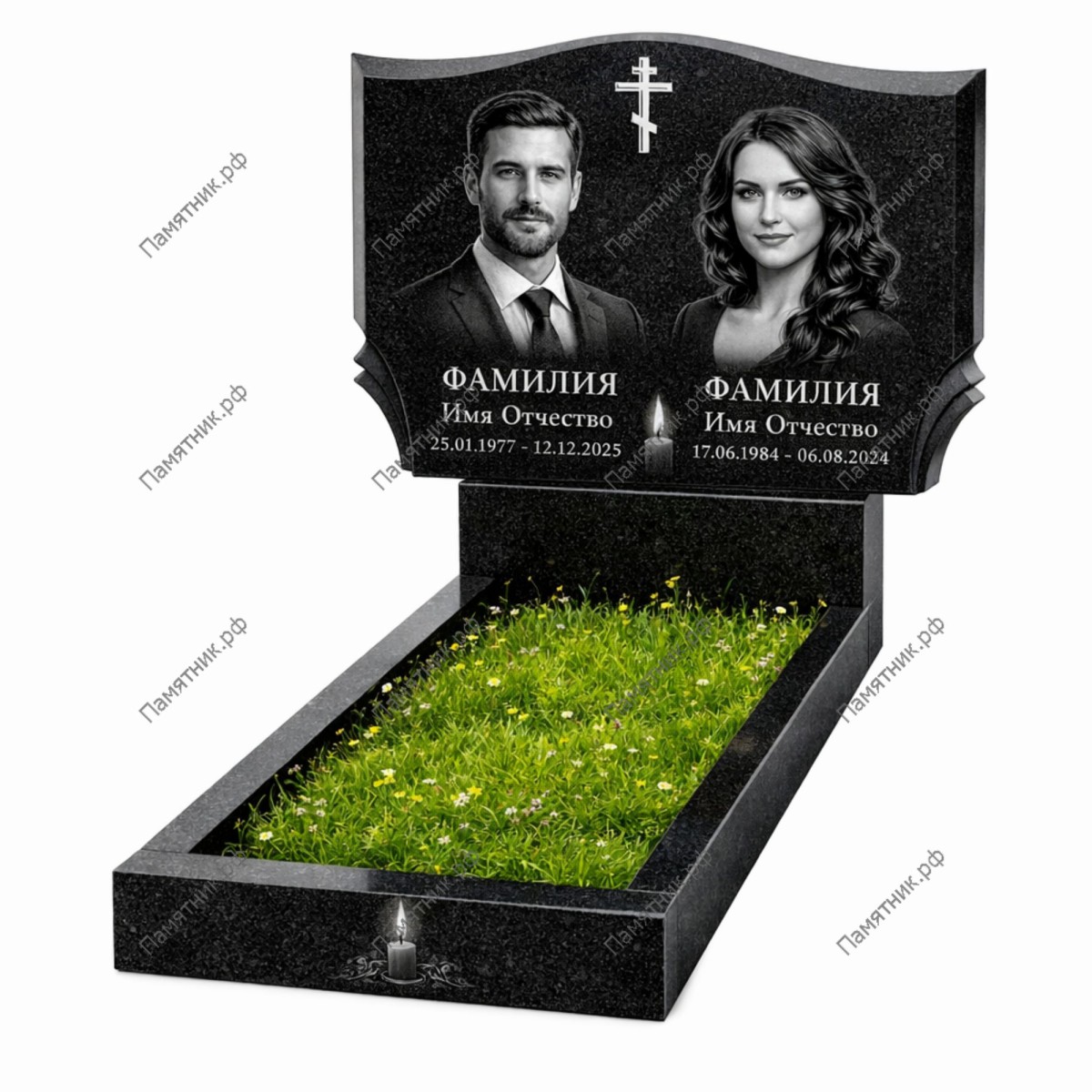 Материалом служит натуральный гранит Габбро-диабаз черного цвета. Это эталон долговечности: камень не требует частого ухода и сохраняет четкость гравировки портретов на века. Форма стелы позволяет оригинально скомпоновать информацию, подчеркивая индивидуальность каждого из близких.