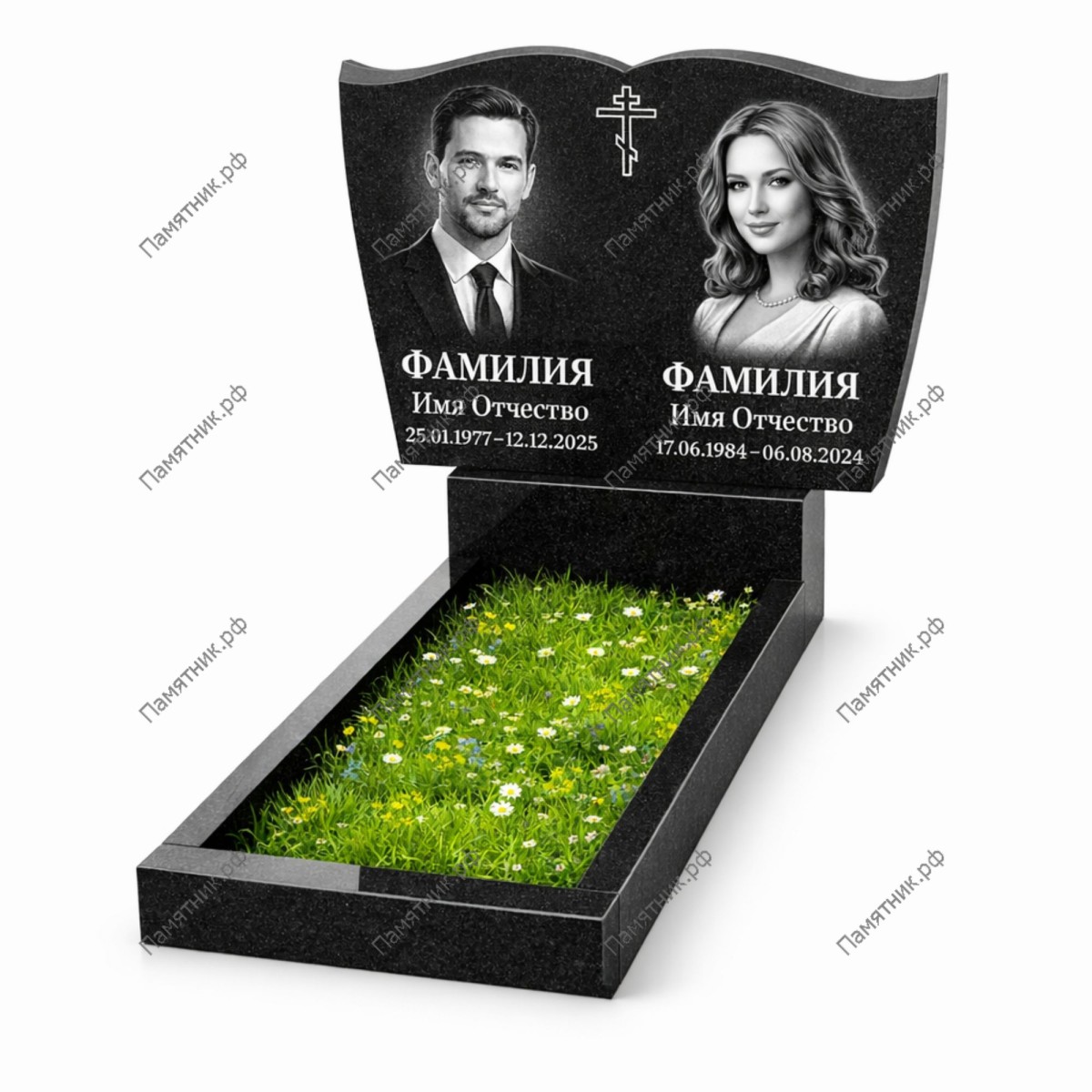 Памятник двойной ПД-7 выполнен в виде раскрытой книги с мягкими волнообразными краями, что символизирует завершенную, но вечно живую историю двух судеб. В верхней части композиции расположен изящный православный крест, венчающий мемориал и придающий ему особую торжественность.