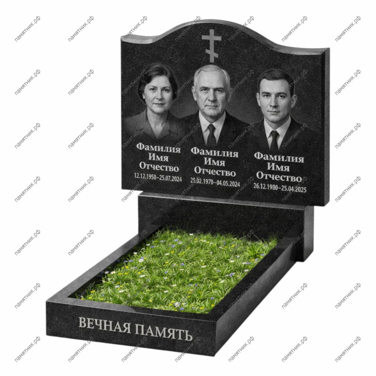 Солидный и торжественный семейный мемориал. Стела имеет фигурное навершие со ступенчатым возвышением по центру, где выгравирован лаконичный крест. Отличительной деталью этого комплекса является глубокая, хорошо читаемая гравировка «ВЕЧНАЯ ПАМЯТЬ» на фронтальном профиле цветника. Памятник символизирует прочность семейных связей, которые остаются нерушимыми даже после земной жизни.