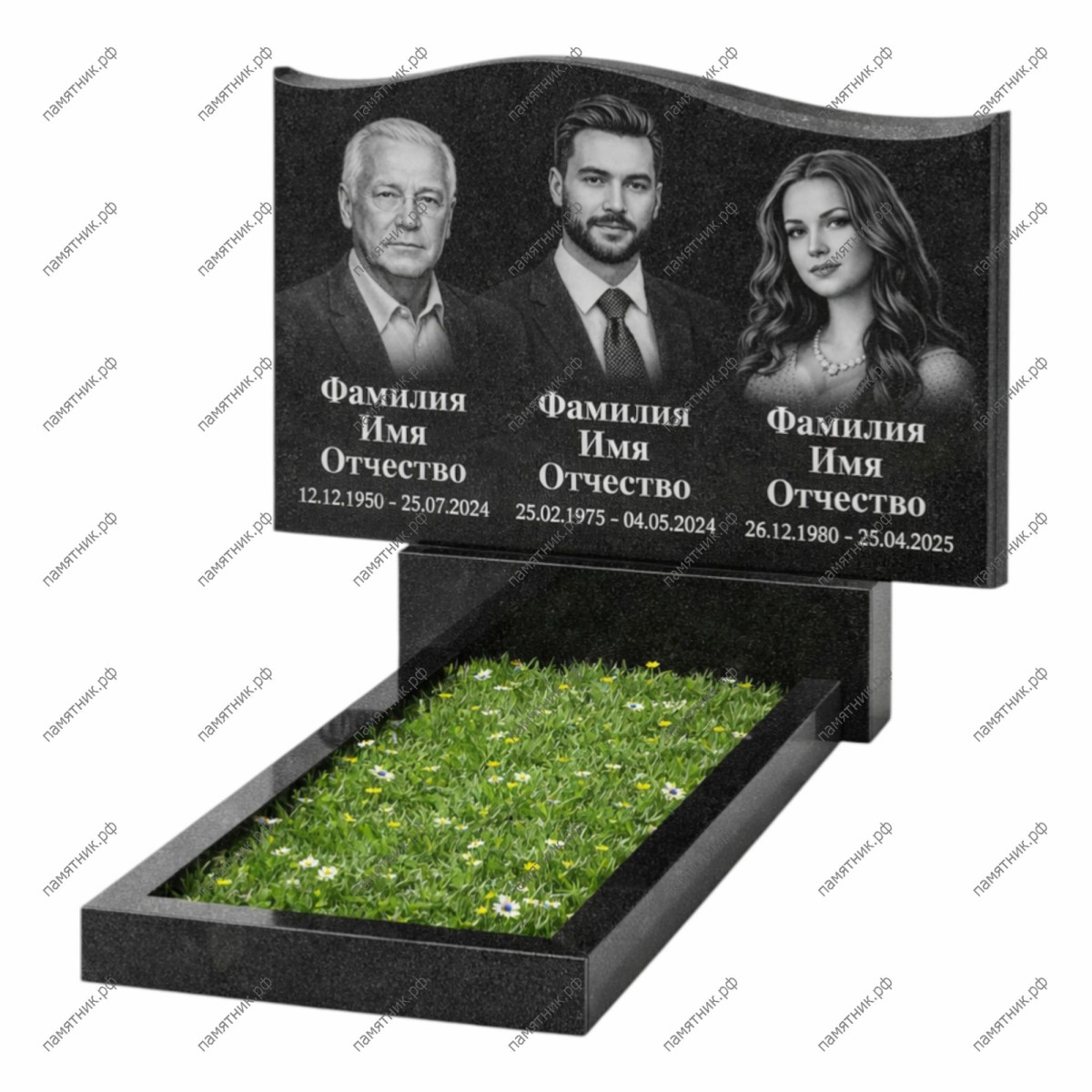 Классический горизонтальный памятник с элегантной асимметричной волной по верхней кромке. Плавный перепад высоты визуально облегчает массивную гранитную плиту, придавая ей гармоничный и спокойный вид. Широкая лицевая поверхность габбро-диабаза идеально отполирована, создавая безупречный черный фон для контрастной и детальной гравировки трех портретов. Модель символизирует светлую память и умиротворение.
